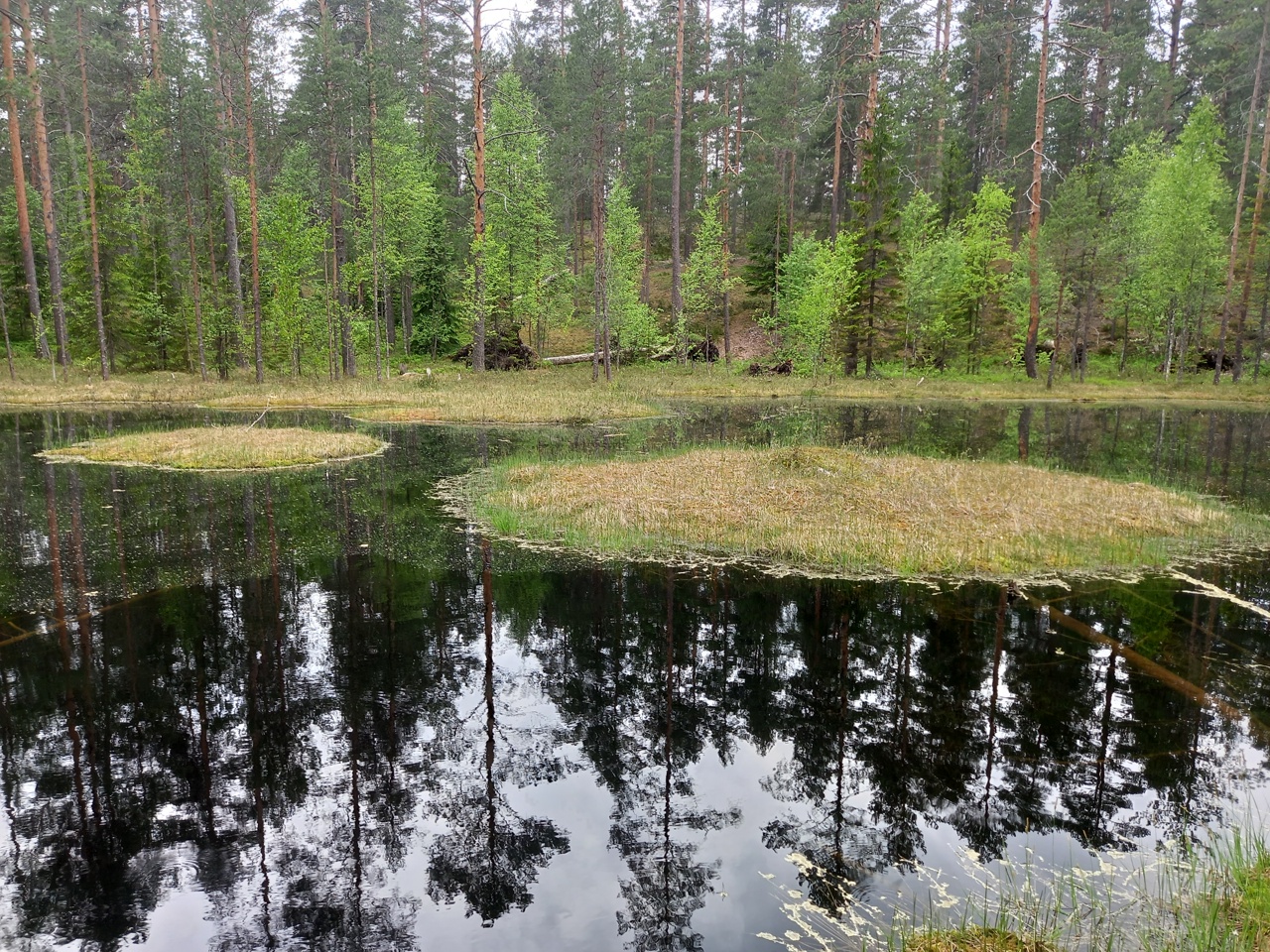 Вода черная, в середине озерца плавают островки из торфа. Озеро без названия, без стоянок для отдыха и вне плана, поэтому в список посещенных не вошло, но в отчете о походе стоит его упомянуть.
