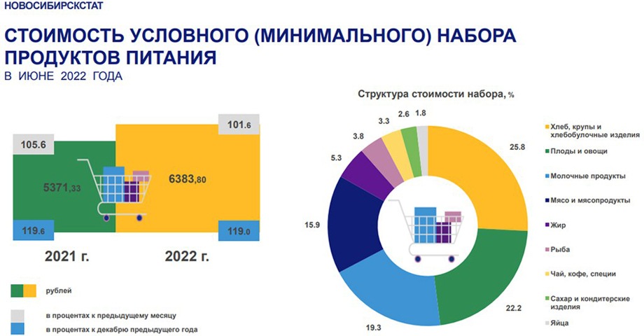 Стоимость минимального набора продуктов в Новосибирской области продолжает резко расти. За весь 2021 год он подорожал на 19,6% до 5,37 тыс. рублей, а за первую половину 2022-го — еще на 19% (до 6,38 тыс.), следует из данных Новосибирскстата.