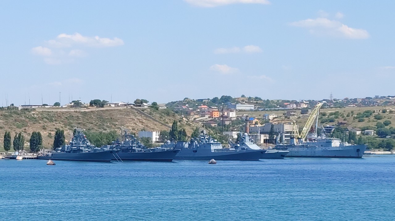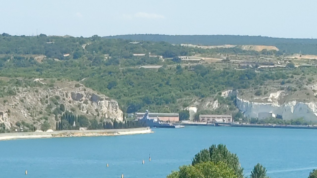 В Сухарной бухте у причала стоит малый ракетный корабль проекта 21631 «Буян-М». На Черноморском флоте четыре таких МРК: «Вышний Волочек» (бортовой номер 609), «Орехово-Зуево» (626), «Ингушетия» (630) и «Грайворон» (600). Из них у МРК «Вышний Волочек» и МРК «Орехово-Зуево» нижняя часть кормы выкрашена в черный цвет, как у корабля на фото. Каждый МРК может нести 8 крылатых ракет «Калибр».