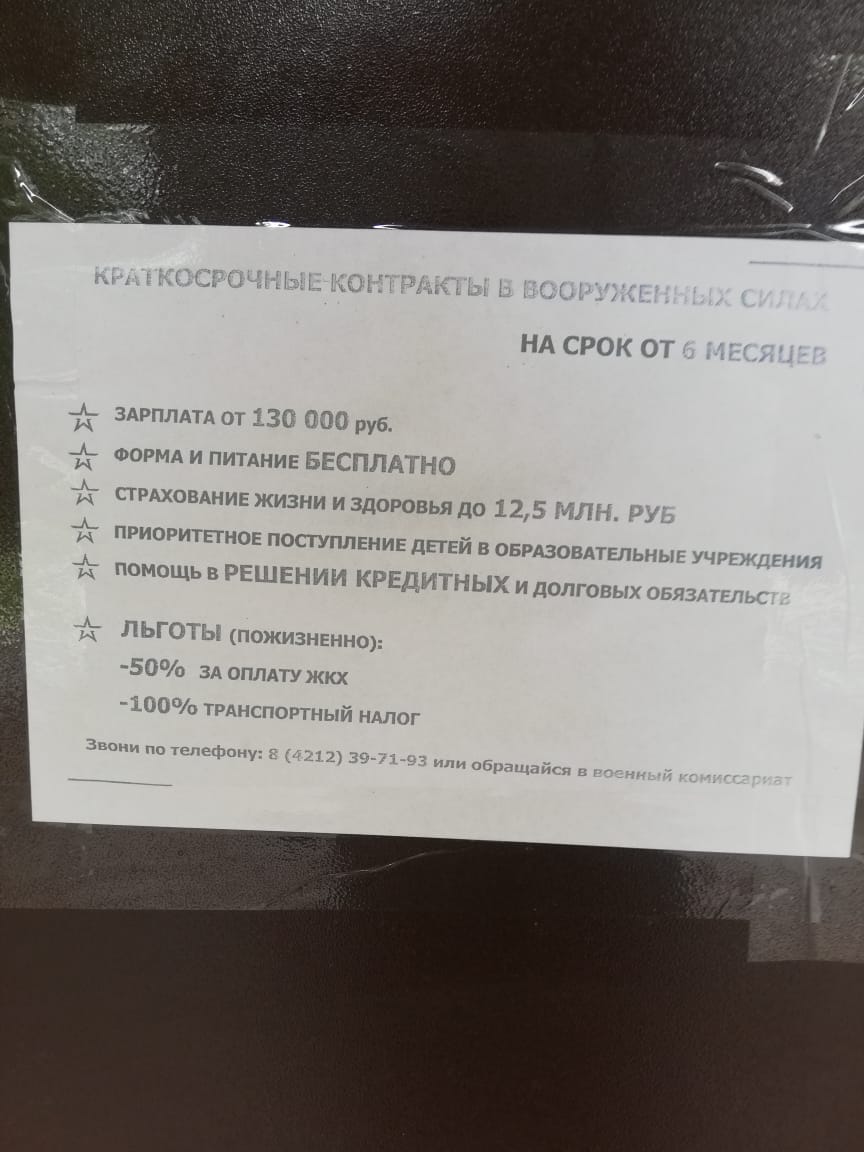 Объявления с приглашением на работу висит и в торговых центрах, и в госучреждениях. Зовут в контрактники и на популярных сайтах по поиску работников. Только на headhunter — HH.ru — находится больше 1800 вакансий «военнослужащий». Условия разнятся от региона к региону. В Москве, например, можно рассчитывать на 250 тысяч рублей в месяц, а в Тюмени — 35 тысяч. В обязанности входит служба с 7:50 до 17:50 в части, на флоте. А доплаты, например, идут за выход в море от 9000 за раз, сдачу нормативов и прочие заслуги.