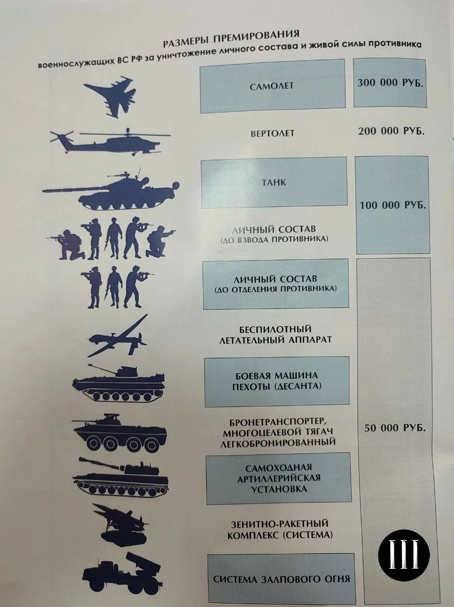 Премирование предусмотрено для военных, проходящих военную службу по контракту. Размер денежного довольствия и премий варьируется от 50 тысяч за ликвидацию личного состава, автомобильной техники и беспилотников до 300 тысяч рублей за самолет. За уничтожение взвода или танка обещают 100 тысяч рублей.