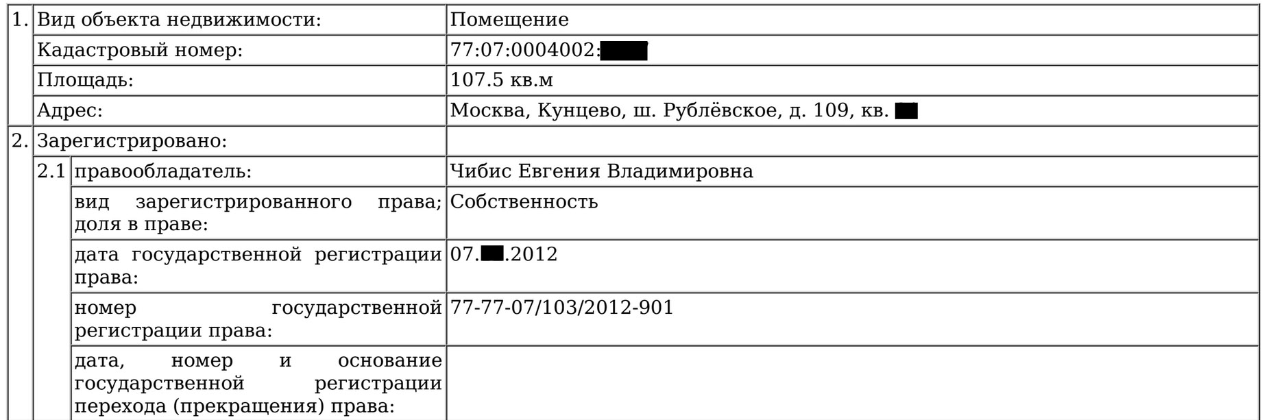 140-метровая квартира в собственности Евгении Чибис появилась в 2017 году, когда её супруг трудился в Министерстве строительства и был главным жилищным инспектором. Что интересно, пятиэтажный десятиквартирный дом, в котором Чибисы свили семейное гнёздышко, расположен на участке с видом разрешённого использования «под личное подсобное хозяйство».