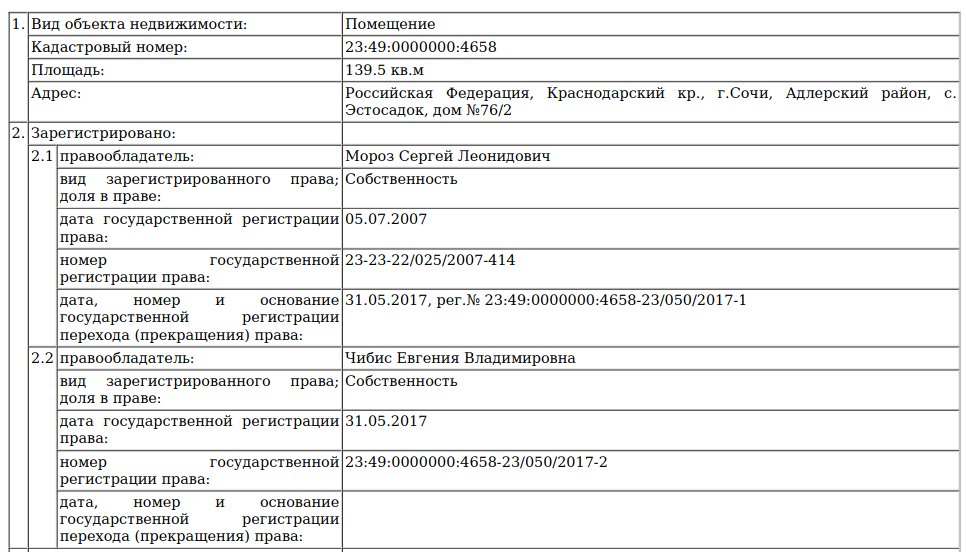 На сайте администрации Сочи даже есть целый раздел об этой проблеме, но дома Чибисов в этом реестре нет. Надо же. Может быть, это связано с тем, что в то время, когда Евгения Чибис оформила право собственности в этом самострое, её муж как раз контролировал жилищную сферу России?