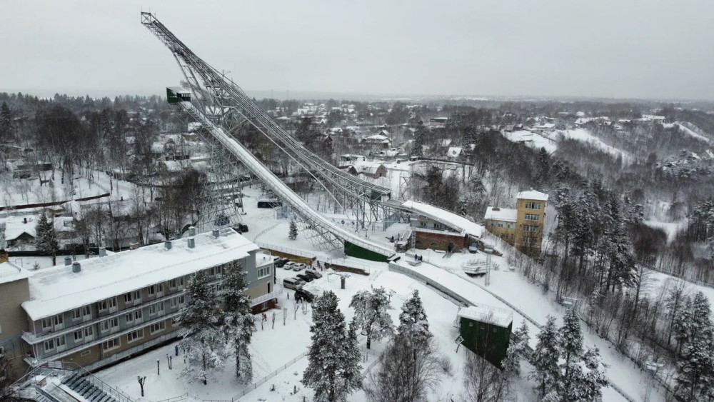 — От подножия трамплина хороший вид на озеро и лес рядом. Действующий трамплин для прыжков на лыжах.