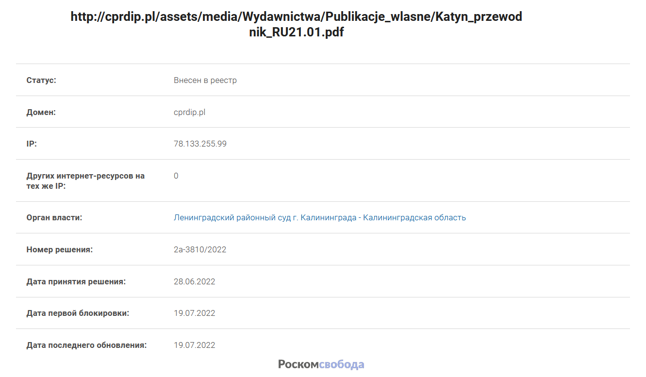 Ленинградский районный суд города Калининграда в конце июня текущего года удовлетворил иск прокурора Калининградской области по запрету на распостранение в Интернете книги «Катынь. По следам преступления».