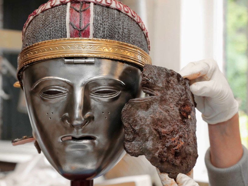 Среди находок была и металлическая пластина, которая, как и остальные предметы, была доставлена в Археологический музей Крефельда для консервации и изучения. Рентген показал, что на фрагменте имеется прорезь для глаза, рельефное изображение уха и заклепка на месте крепления к шлему. Тогда исследователи поняли, что перед ними фрагмент кавалерийской маски — редкого элемента римской амуниции.