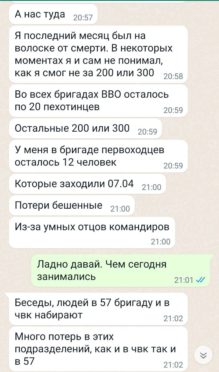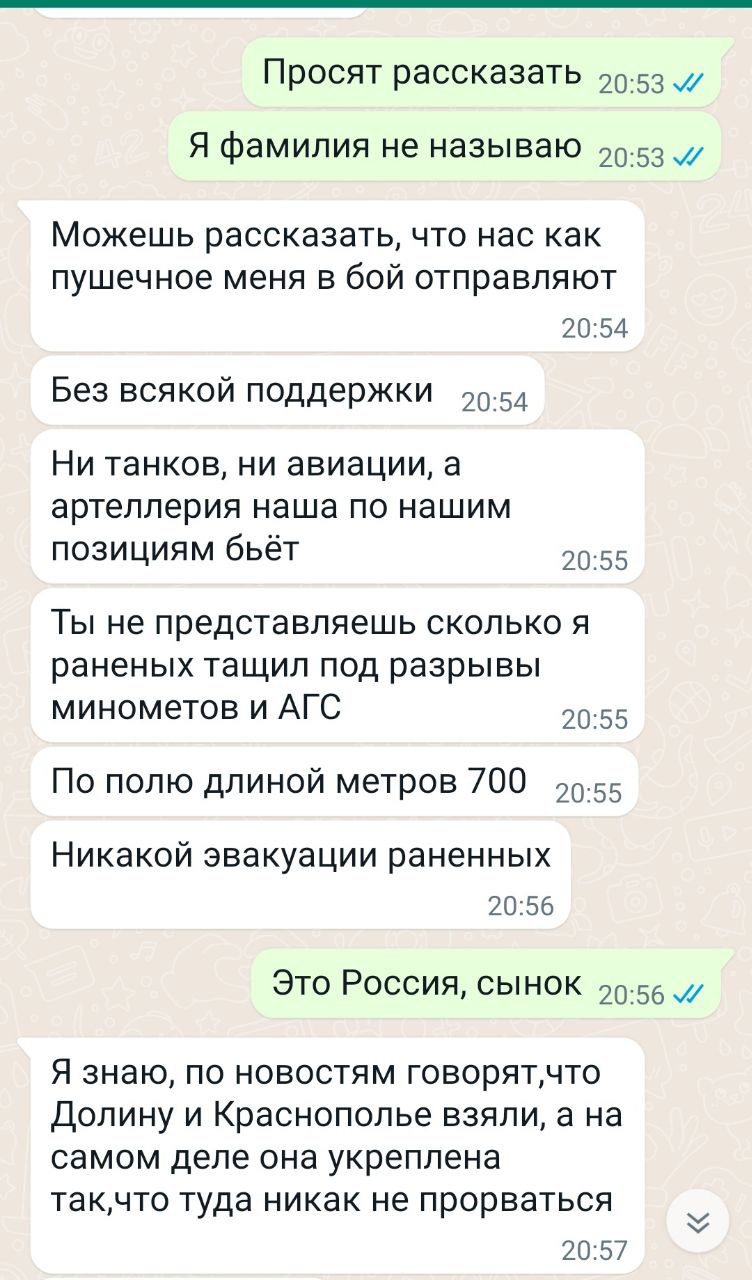 "Кричат в один голос: вы боитесь, вы предатели. А людей просто на убой отправляют, без техники, без поддержки. Арта по своим стреляет. Там такой ужас творится. Командование вообще не понимает, что делает, просто на явную смерть отправляют. Знают, что засады, им об этом говоришь, а они говорят, что это все херня, там никого нет, отправляют туда людей, и треть только возвращаются оттуда, просто людей на убой. Технику не дают, авиация нет, рэб не работает", – такое сообщение своего родственника прислала Ирина, одна из подписавших обращение.