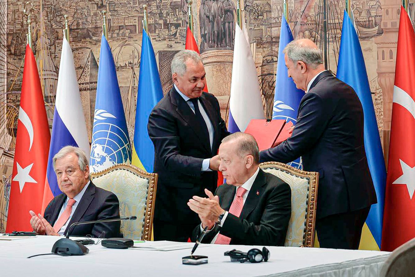 Vadim Savitsky / Press Service of the Russian Ministry of Defense / AP / Scanpix / LETA UN Secretary-General António Guterres, Russian Defense Minister Sergey Shoigu, Turkish President Recep Erdoğan, and Turkish National Defense Minister Hulusi Akar (in the back on the right) at the signing of Friday’s agreement between Russia, Turkey, and the UN.