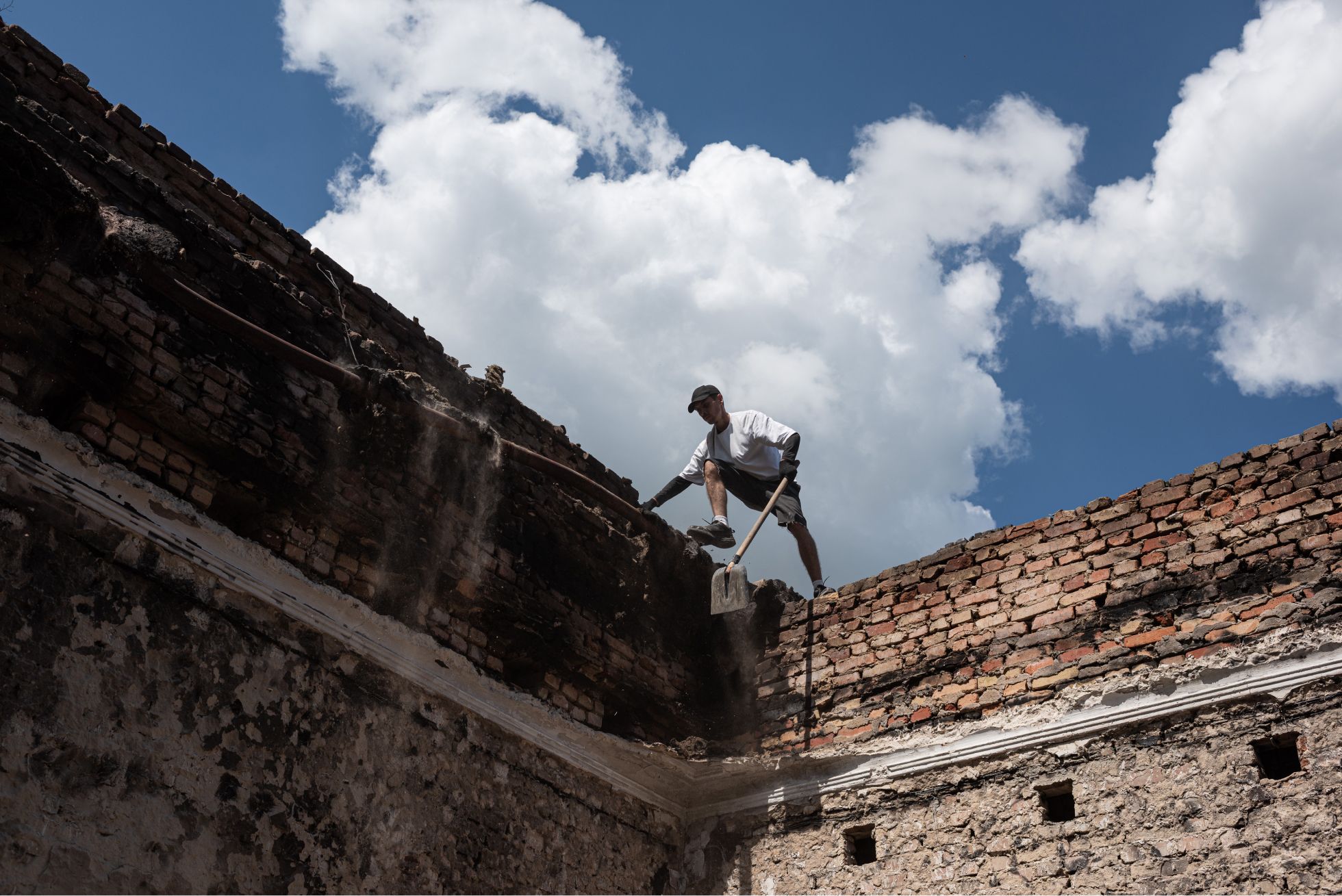 Волонтер очищает от обломков крышу дома культуры села Ягодное (Черниговская область)