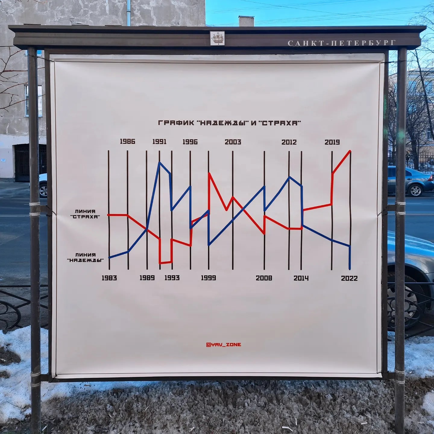 Александр: Добавлю немного. Главная сила наших работ — внезапность. Плюс должна быть веская причина для привлечения. Мы же работаем аккуратно: берём заброшенные локации, не портим культурное наследие. До нас надо сначала докопаться, но разбирать каждую работу — сложно. Именно поэтому мы долго обсуждаем, проверяем риски, чтобы зашифровать в работах мелочи, которые те, кто нужно, поймут, а те, кто не нужно, — нет.