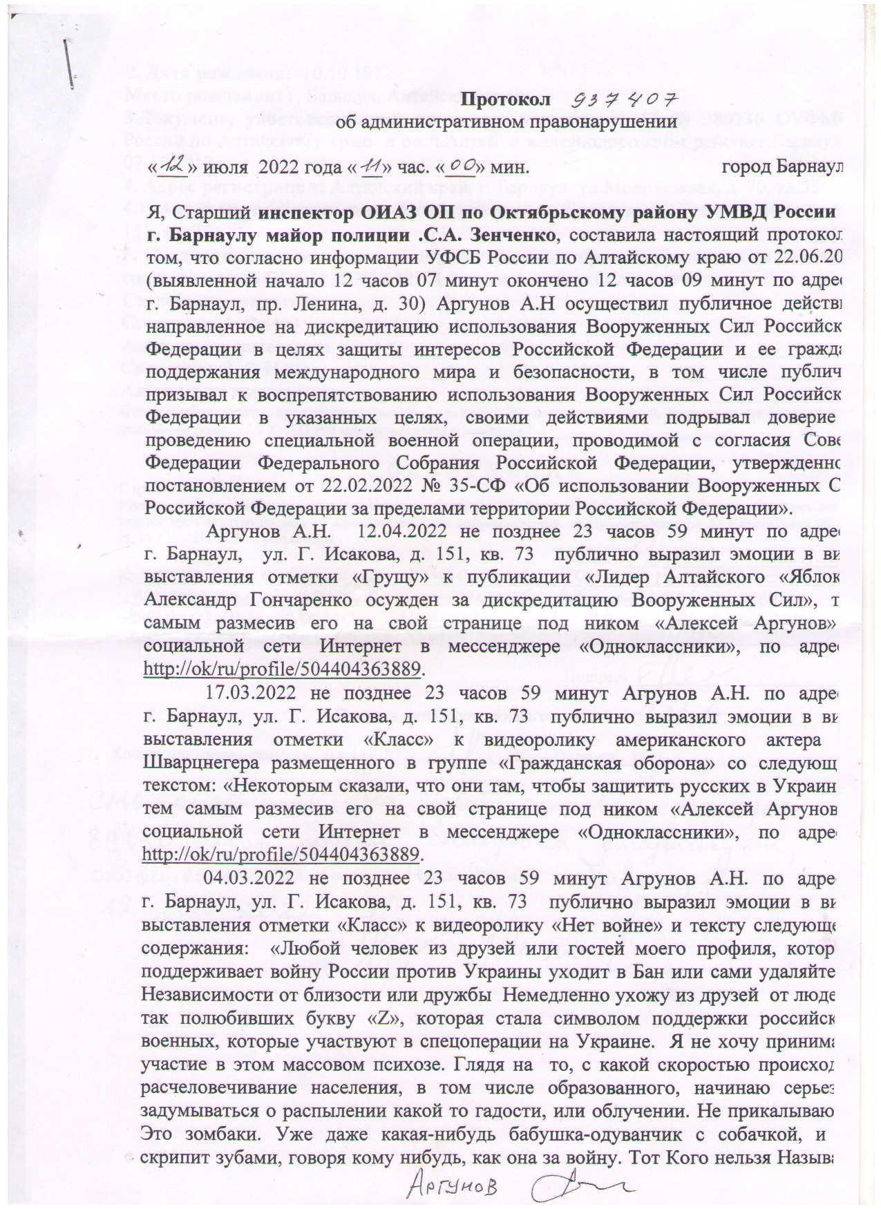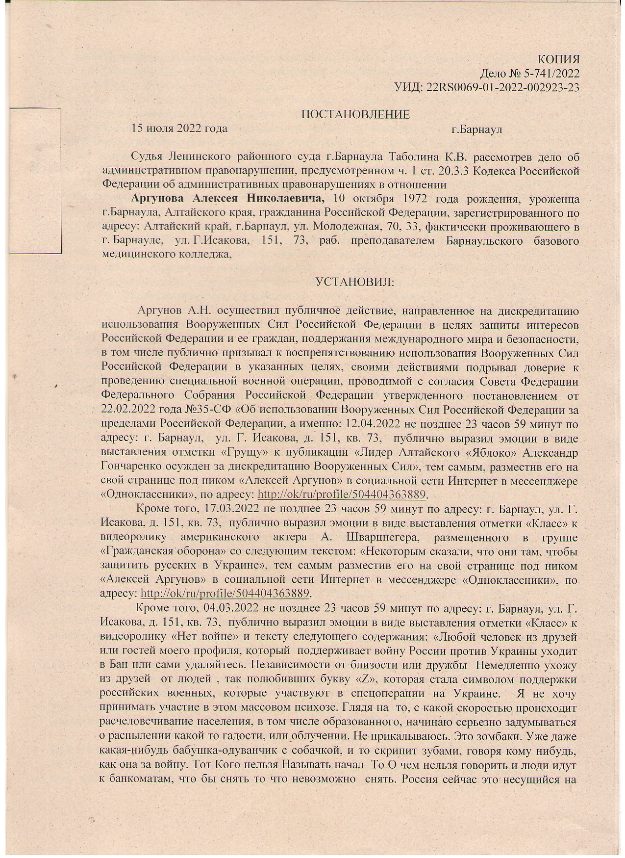 – Мне позвонили из УВД, сказали: "Надо к нам подойти, у нас тут разговор с вами есть". Пришел, они мне эти "материалы по дискредитации" показали и сказали, что надо написать объяснение. Так я и узнал, что оказывается под дискредитирующие армию действия попадает грустный смайлик под чужим постом о том, что лидера алтайского "Яблока" Гончаренко осудили по этой же статье о дискредитации. Или эмоджи "класс" под видео "американского актера А. Шварценеггера, размещенного в группе "Гражданская оборона" со следующим текстом: "Некоторым сказали, что они там, чтобы защитить русских в Украине", – перечисляет вмененные "эпизоды" Аргунов. – Когда шел туда [в полицию], даже не представлял, что вменят, да еще и "лайки" – все же за гранью за такое судить. Но не испугался, расценил это как шутку. Я человек спокойный, понимал, что в социальных сетях обычно посерьезнее публикуют. С другой стороны, и сами полицейские показывали, что понимают, дело несерьезное, даже глуповатое какое-то. Мол, эфэсбэшники спустили, надо отчитаться. Поэтому было ощущение, что я напишу объяснительную и на этом все и закончится, что дальше в суд дело не будут передавать.