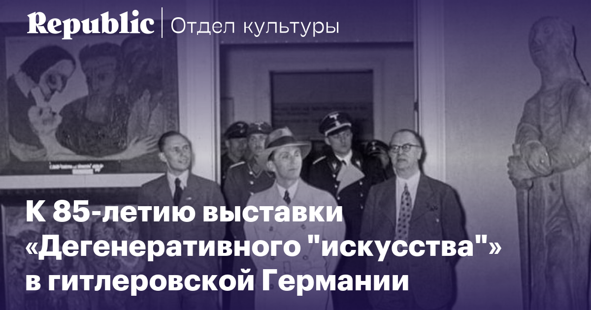 Выставка «Дегенеративного "искусства"» (Die Ausstellung «Еntartete "Kunst"»), открывшаяся 19 июля 1937 года на втором этаже Мюнхенского института археологии, имела целью окончательно разоблачить авангард — так, чтобы больше не поднялся. Заимствованный из биологии термин entartet — в буквальном переводе, дегенеративный, обладающий признаками вырождения — соединялся в названии с искусством, взятым в кавычки — как бы ненастоящим, созданным «кретинами с дефектами зрения» (цитата из Гитлера). Накануне, 18 июля 1937 года, тоже в Мюнхене — в Доме немецкого искусства, специально построенном для фюрера (и по проекту, к которому он, по легенде, приложил руку) открылась Большая германская художественная выставка (Große Deutsche Kunstausstellung), демонстрировавшая «правильное искусство».