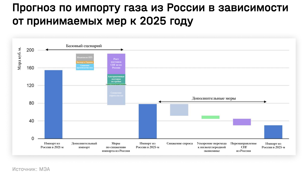 2. Главный ресурс для сокращения зависимости от российского газа — снижение спроса, отмечают в МЭА. Более быстрое внедрение возобновляемых источников энергии снизит потребление газа для производства электроэнергии на 10% к 2025 году. Изменение поведенческих привычек, в частности, снижение температуры в помещениях на 1°C, позволит сэкономить около 10 млрд куб. м в год. Увеличение энергоэффективности и замена газовых водонагревателей на тепловые насосы снизит спрос еще на 10 млрд куб. м.