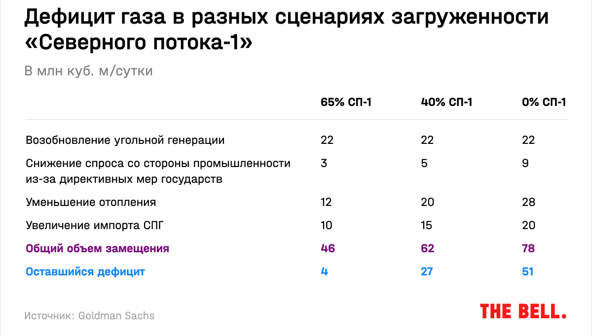По расчетам GS, если план не будет принят, а поставки по «Северному потоку — 1» сохранятся на уровне текущих 40%, дефицит газа составит 14 млрд куб. м до конца марта. Это приведет к тому, что Европе придется ограничивать потребление в промышленности.
