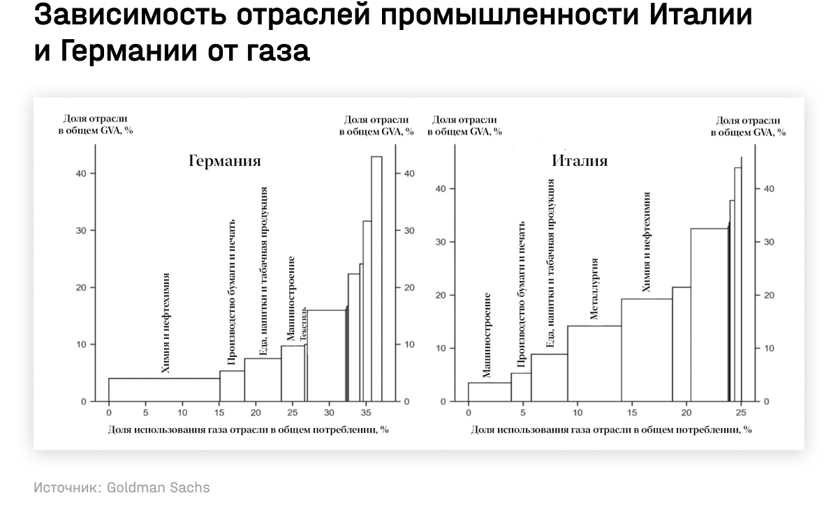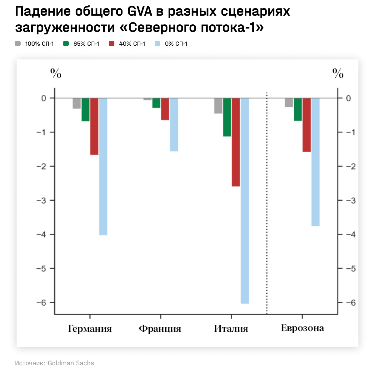 По расчетам GS, при полном отключении поставок дефицит газа в Германии в годовом выражении составит 20 млрд куб. м, что составляет 65% всех потребностей промышленности, в Италии — 12 млрд куб. м (85% потребления в промышленности).