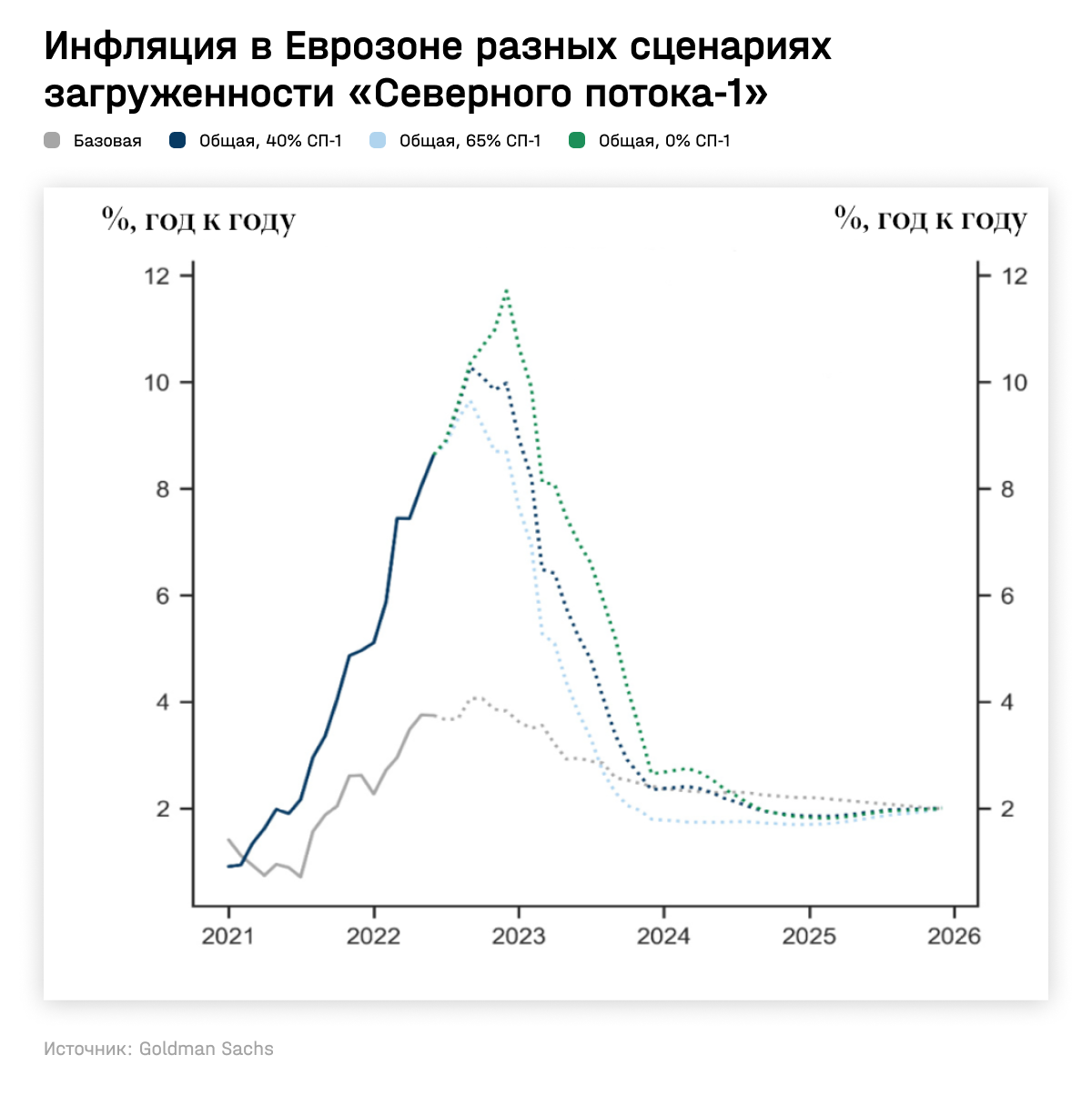 Дефицит газа приведет к ускорению и без того растущей инфляции. Это может ударить по потребительской уверенности. После снижения прокачки по «Северному потоку — 1» в июне GS повысил прогноз по годовой инфляции в еврозоне в сентябре до 10,3%.