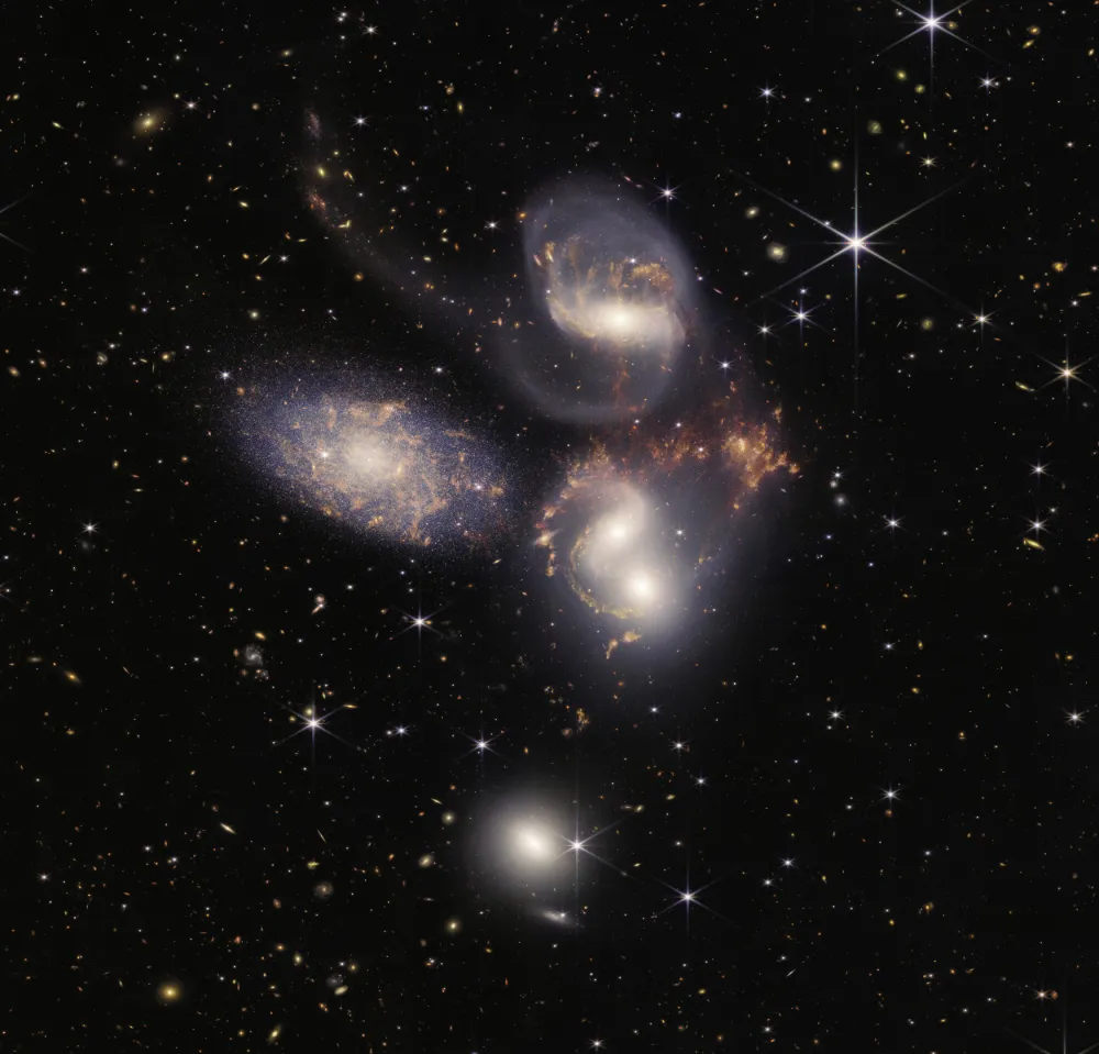 Было еще несколько снимков, на которых засняты планетарная туманность, группа галактик Квинтет Стефана и молекулярные облака. Заметьте, что и здесь снимки «Уэбба» отличаются полупрозрачностью. «Хаббл» видел только поверхность галактики или поверхность молекулярного облака. Пыль не позволяла видимому и ультрафиолетовому свету выйти наружу. «Джеймс Уэбб», наблюдая в инфракрасном диапазоне, видит вглубь. Он видит и свет, исходящий из молекулярного облака, и свет от далеких объектов, проходящий сквозь молекулярное облако. В этом и есть удивительное свойство «Уэбба»: он видит вглубь запыленного пространства. И вглубь диска галактики, и вглубь молекулярного облака или планетарной туманности. Таким образом, «Хаббл» и «Уэбб» дополняют друг друга. Один видит поверхность, другой заглядывает вглубь.