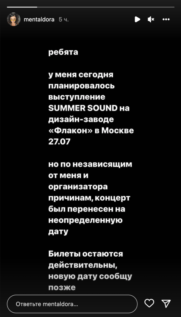 Певице Доре, которая упоминалась в списке «списке запрещенных артистов», выступивших против войны, перенесли концерт в Москве «на неопределенную дату». Он должен был состояться сегодня.