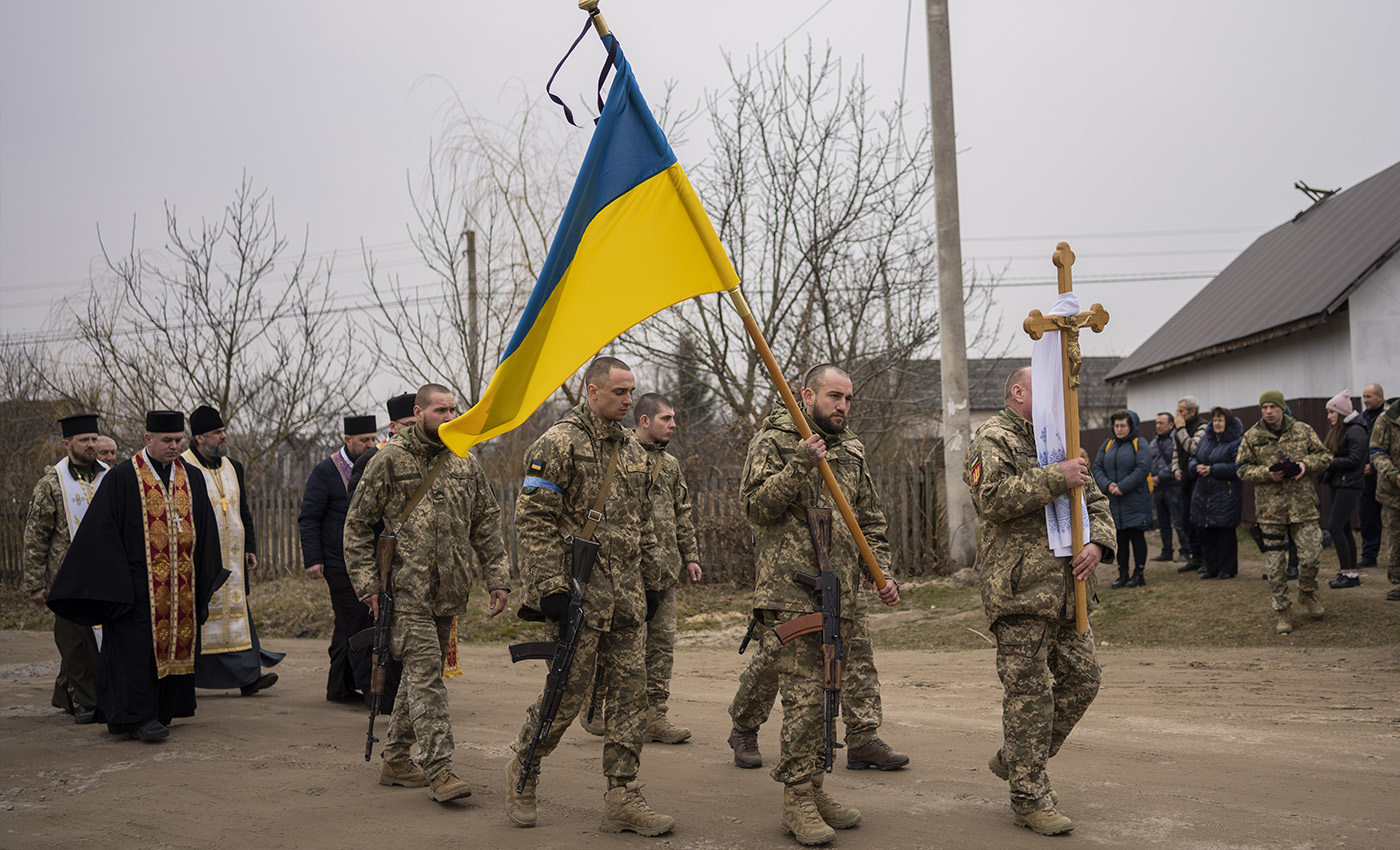 Похоронная процессия после обстрела тренировочной базы, Яворово, 16 марта 2022 года. Фото: Bernat Armangue / AP