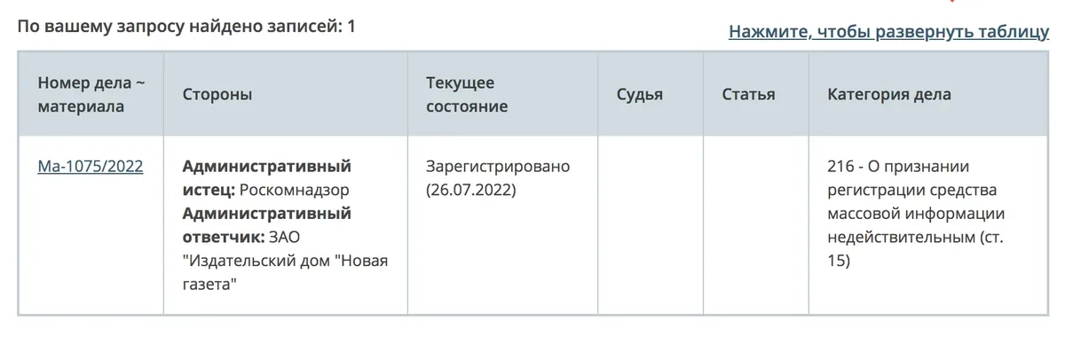 Всего есть два иска — об отзыве регистрации у сайта «Новой газеты» и об отзыве свидетельства о регистрации печатного издания. К сайту иск подан из-за двух предупреждений от Роскомнадзора. Рассмотрение этого иска пройдет в Верховном суде 15 сентября.Иск к печатному изданию зарегистрирован в Басманном суде Москвы, дата рассмотрения пока не назначена.
