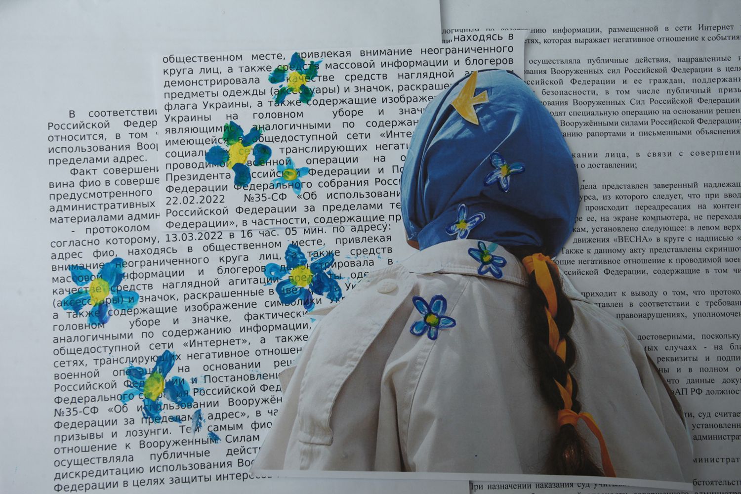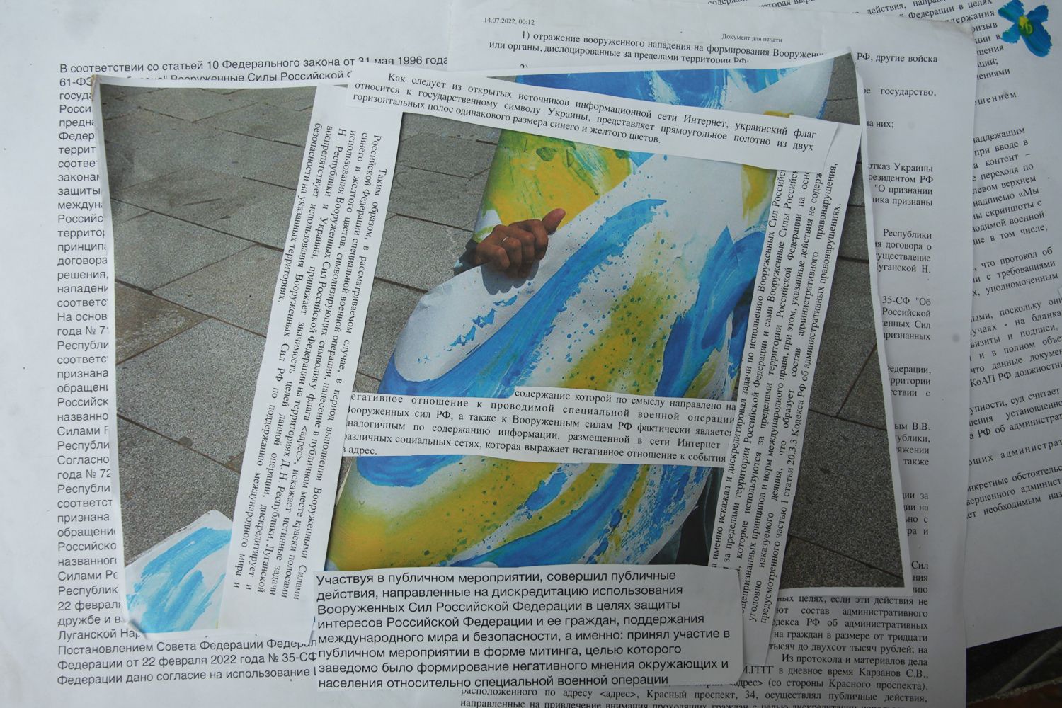 Суд с такой трактовкой не согласился и постановил: «Нанесение в публичном месте краски полосами синего и желтого цветов, символизирующих символику флага [Украины], искажает истинные задачи использования вооруженных сил Российской Федерации на территориях Донецкой Народной Республики, Луганской Народной Республики и Украины».