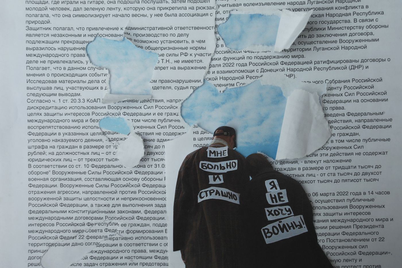20-летний петербуржец Демьян Беспокоев выразил свое отношение к войне с помощью пальто, которое когда-то носил его родственник. «Это пальто моего деда, во время ВОВ он был голодным ребенком на оккупированной территории, — написал Беспокоев краской на одежде. — Мне больно и страшно. Я не хочу войны!»