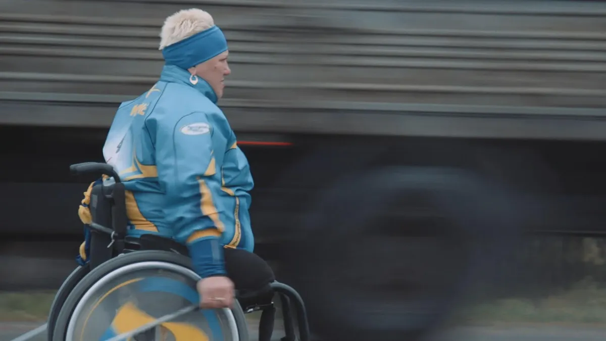 …Трасса между Киевом и Бердичевом. На большой скорости с грохотом проносятся фуры. Пыль и дым. Вдоль разделительной линии, отталкиваясь палками от асфальта, едет героиня в инвалидной коляске. На ней желто-синяя спортивная форма. Так тренируется золотая медалистка Паралимпийских игр.