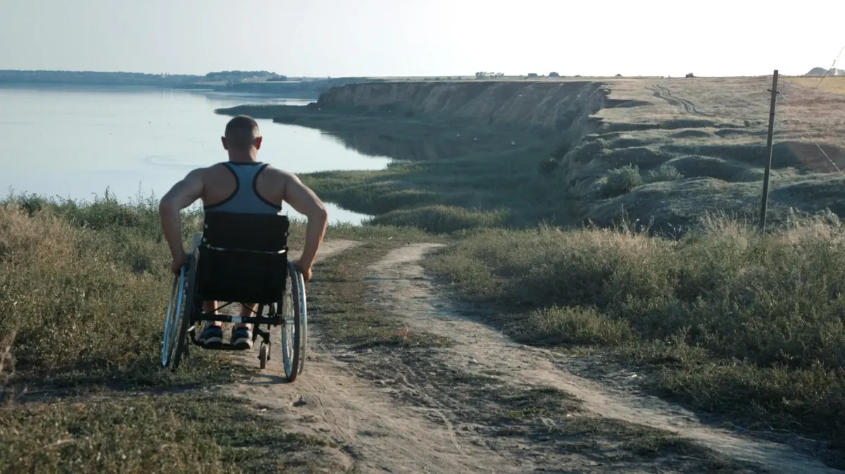 …Война идет уже два года. Герой сидит в коляске на одесском пляже, его парализованные ноги касаются песка, на них набегает волна. Подходит женщина и спрашивает: «Вы ветеран АТО?» В другом эпизоде тот же герой катает сидящих у него на коленях трех малышей, скорее всего — таких же «временно перемещенных лиц», как и он сам. У одного из мальчиков игрушечный пистолет. Спортсмен катит коляску, а мальчик стреляет с его колен: «Пуф! Пуф! Пуф!»