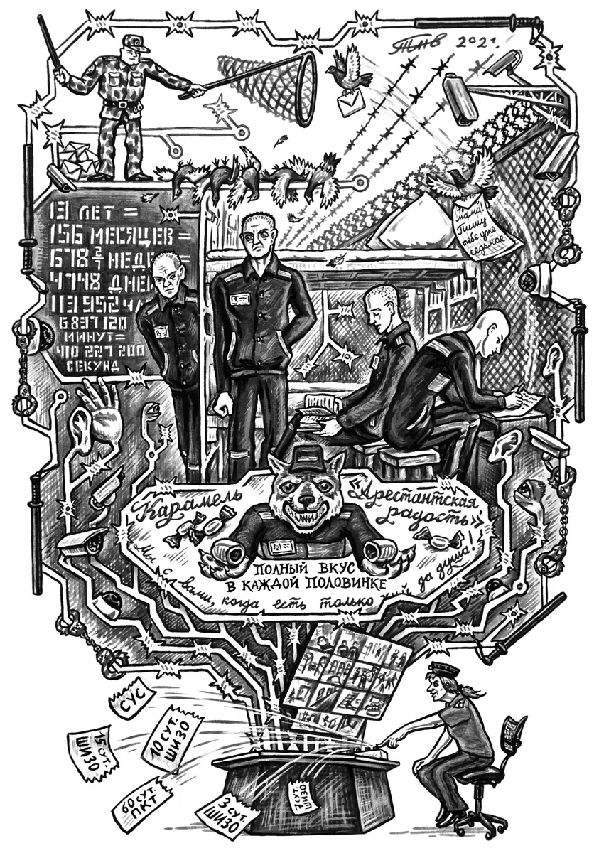 «Новая газета. Европа» продолжает публиковать главы из книги бывшего политического заключенного Ивана Асташина «Путешествие по местам лишения». Асташин — фигурант одного из первых «придуманных» спецслужбами дел о молодых террористах. В 2012 году его, 20-летнего студента, приговорили к 13 годам строгого режима. За три года до этого Иван с «подельниками» поджег подоконник и несколько стульев в отделе ФСБ на «день чекиста». Тогда никто не пострадал, но спецслужбы раздули поджог до дела «Автономной боевой террористической организации». Из назначенных 13 лет Иван отбыл почти 10 — в том числе в ИК-17 Красноярского края и Норильлаге.Он вышел на свободу только в сентябре 2020 года, но и на этом зона не закончилась — политзеку назначили 8 лет административного надзора с запретом выходить из дома по ночам. «Это хуже условного срока», — говорит он сам.