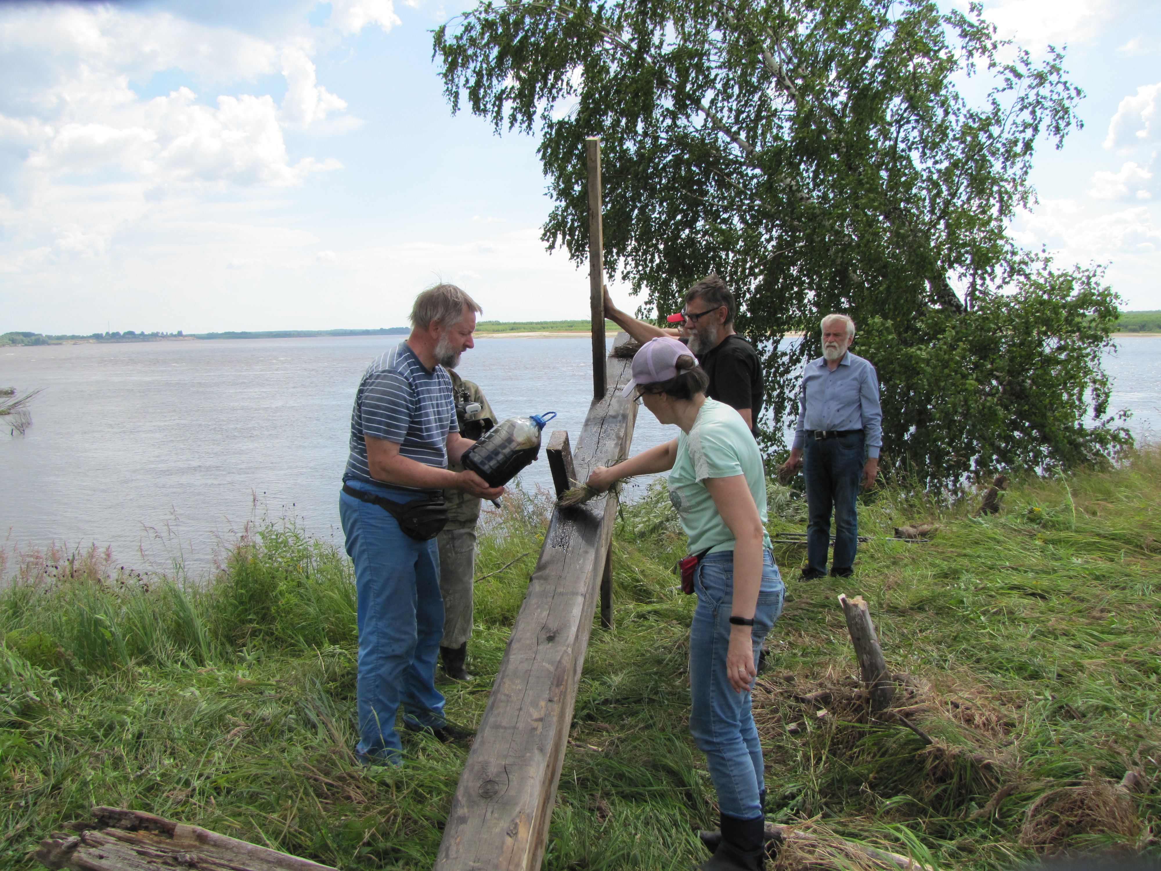 Работы на этот раз оказалось больше, потому что крест пришлось изготавливать прямо на месте. Четырехметровый брус привезли на моторной лодке. Потом его предстояло поднять на отвесный берег, вытесать топором пазы для перекладин и укрепить их на основании креста. Для пропитки в этот раз использовали отработанное машинное масло. Получилось не хуже, чем олифа. Красили всем миром при помощи импровизированных кисточек, которые тут же сделали из травы.
