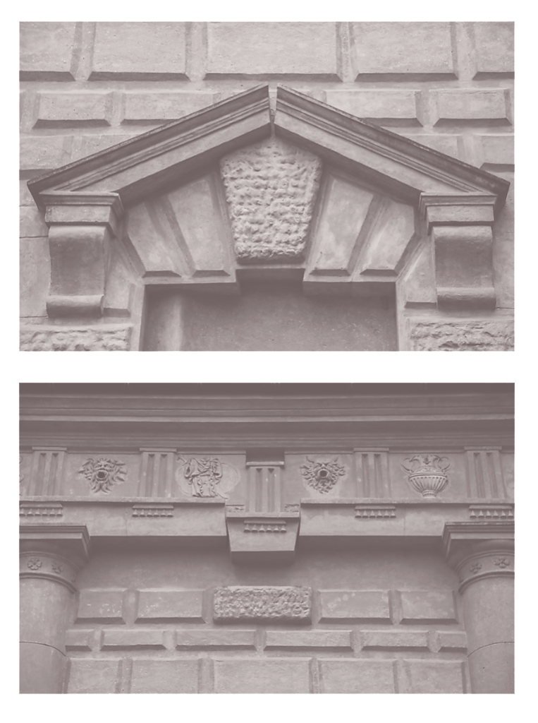 Палаццо дель Те близ Мантуи. Детали внешнего убранства (вверху — фрагмент окна, внизу — фрагмент фриза). Архитектор Джулио Романо. 1524–1534 годы. Фотография Олега Воскобойникова, 2017