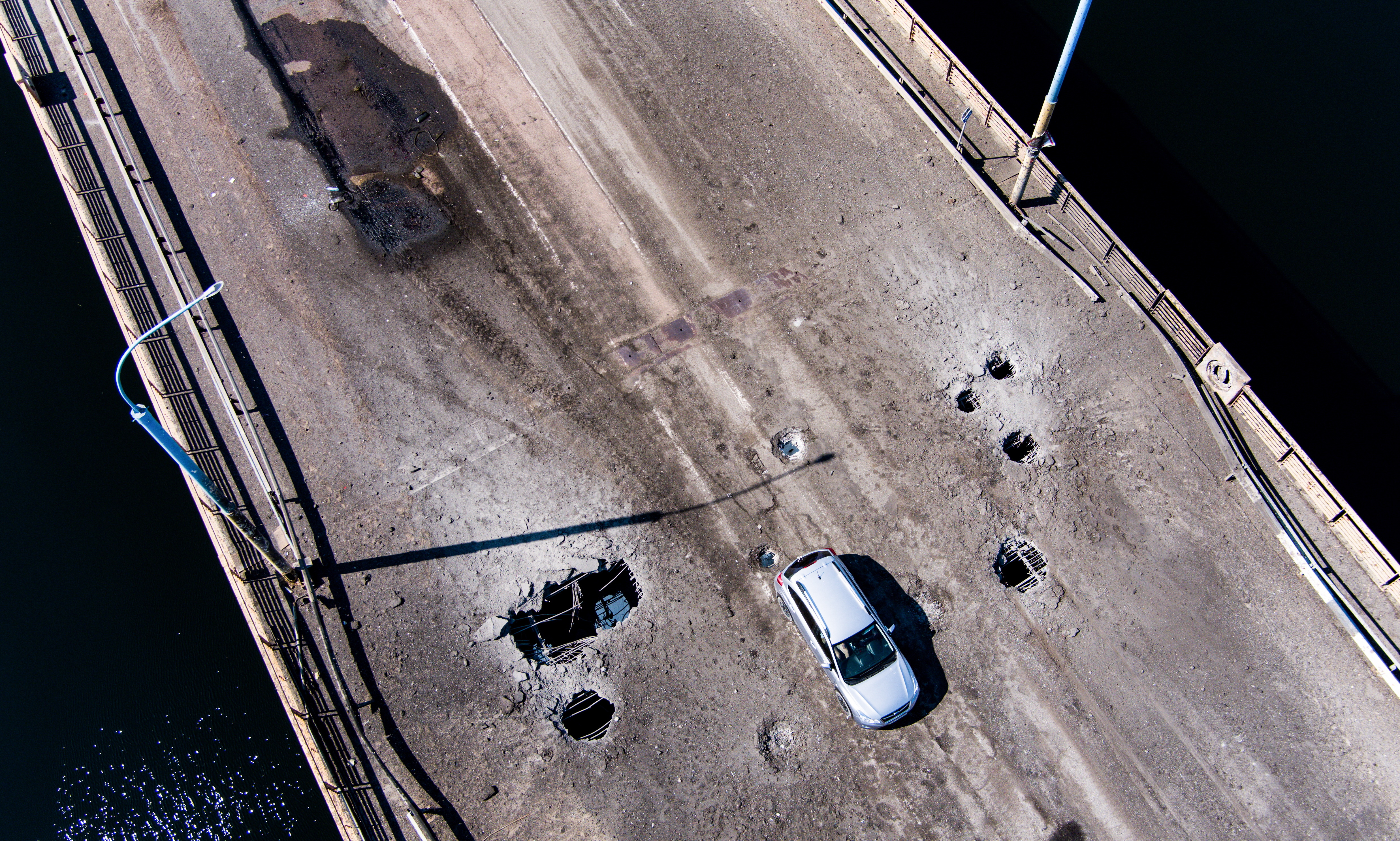 Антоновский мост через Днепр, соединяющий Херсон с левобережьем, после первых ударов ВСУ, 20 июля 2022 года