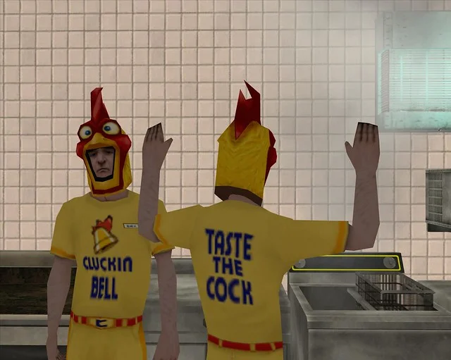 С началом классической эпохи 3D GTA приобрела яркую черту: проработанный игровой мир, в котором каждая вывеска или реплика была культурной отсылкой или шуткой. Спортивный магазин в GTA будет называться Pro Laps — это игра слов, указывающая одновременно на профессиональные способности наматывать круги (laps), и на prolapse — выпадение прямой кишки через анальное отверстие. На форме кассира в местном аналоге KFC будет написано Taste the Cock (опять игра слов: cock — петух, cock — пенис).