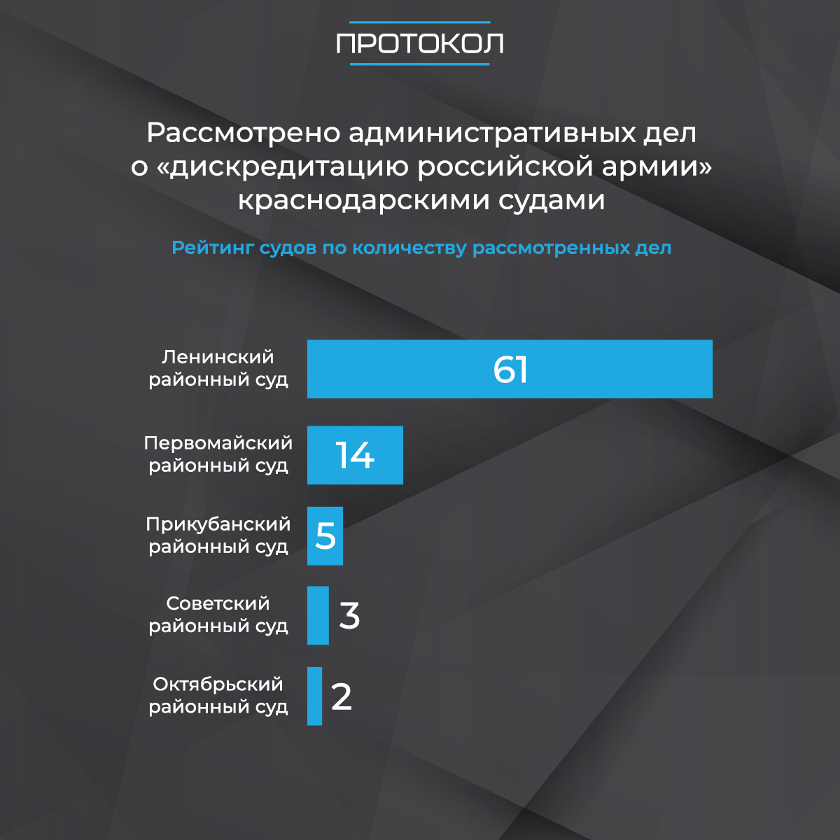Сейчас на сайтах судов Краснодара опубликовано 85 карточек административных дел о «дискредитации». 70% этих административных дел достались Ленинскому районному суду: один раз судья оштрафовал активиста, участвовавшего в протестной акции с плакатом «Нет войне» на 40 000 рублей; 33 раза судьи штрафовали активистов и обычных граждан, не поддерживающих войну на 30 000 рублей; 13 раз несогласных с войной оштрафовали на 15 000 рублей; в семи случаях установить размер штрафа невозможно, потому что решения не опубликованы на сайте суда, но в карточках дел указано, что судом было принято решение о назначении административного наказания; дважды дела передавали по подсудности; один раз дело вернули из-за «составления протокола и оформления других материалов дела неправомочными лицами»; четырежды административные дела прекращали в связи с отсутствием состава правонарушения. Общая сумма штрафов в опубликованных решениях Ленинского районного суда — 1 225 000 рублей.