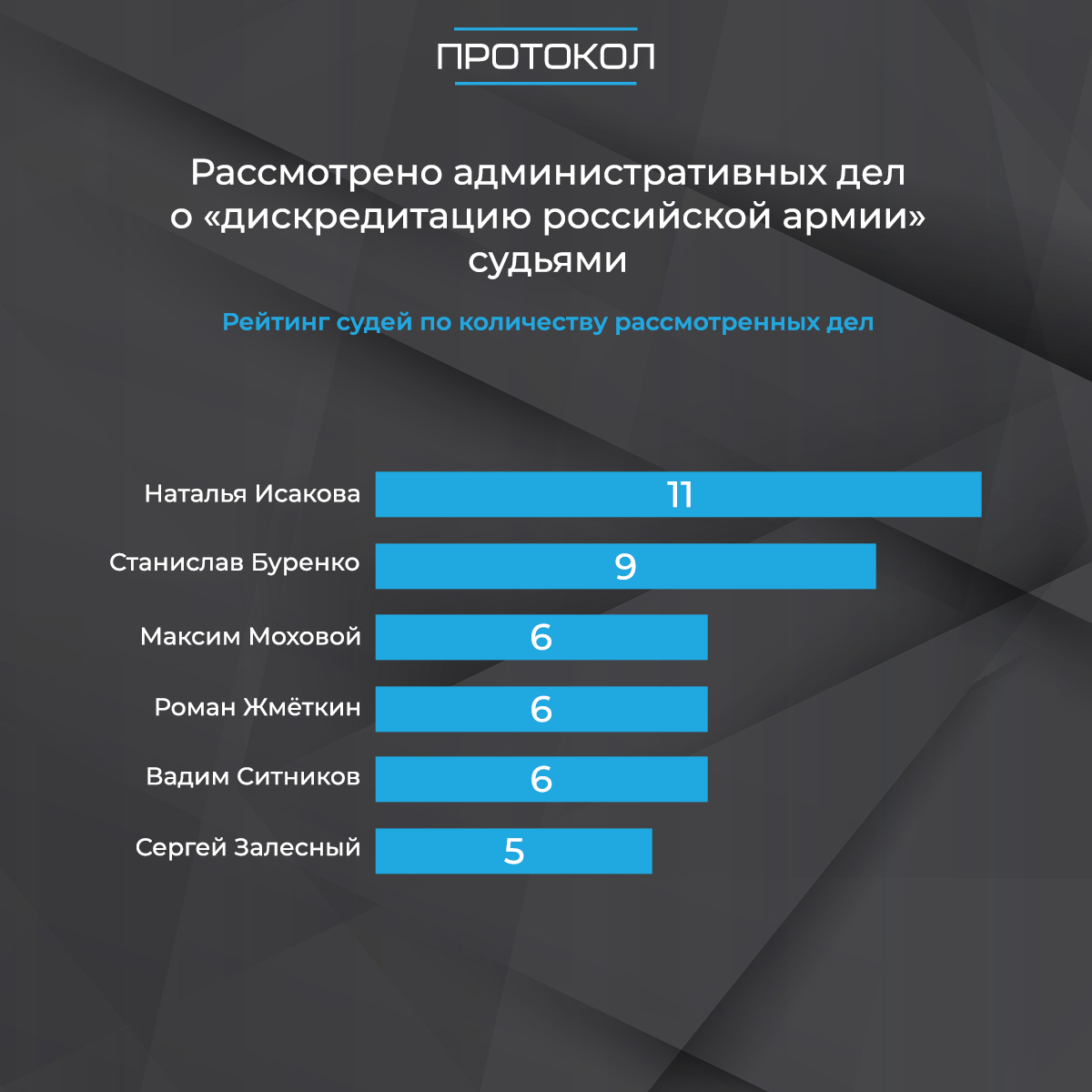 По количеству решений среди всех районных судей лидирует Наталья Исакова — ей досталось 11 дел. Из данных на сайте суда мы делаем вывод, что ей же досталось первое антивоенное административное дело в Краснодаре. Этот материал она передала по подсудности в другой суд. Позже точно так же она поступила с ещё одним делом. Тем не менее, в девяти случаях Наталья Исакова принимала решения о штрафах — всего она наложила их на 210 000 рублей.