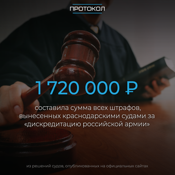 В начале марта 2022 года в кодексе об административных правонарушениях появилась статья за «публичные действия, направленные на дискредитацию использования Вооруженных Сил Российской Федерации». Краснодарские суды тут же принялись штрафовать несогласных с началом войны в Украине. В общей сложности с марта краснодарские суды оштрафовали горожан за «дискредитацию армии» минимум на 1 720 000 рублей. «Протокол» посчитал и разобрался, кто из судей наиболее преуспел в преследовании краснодарцев.