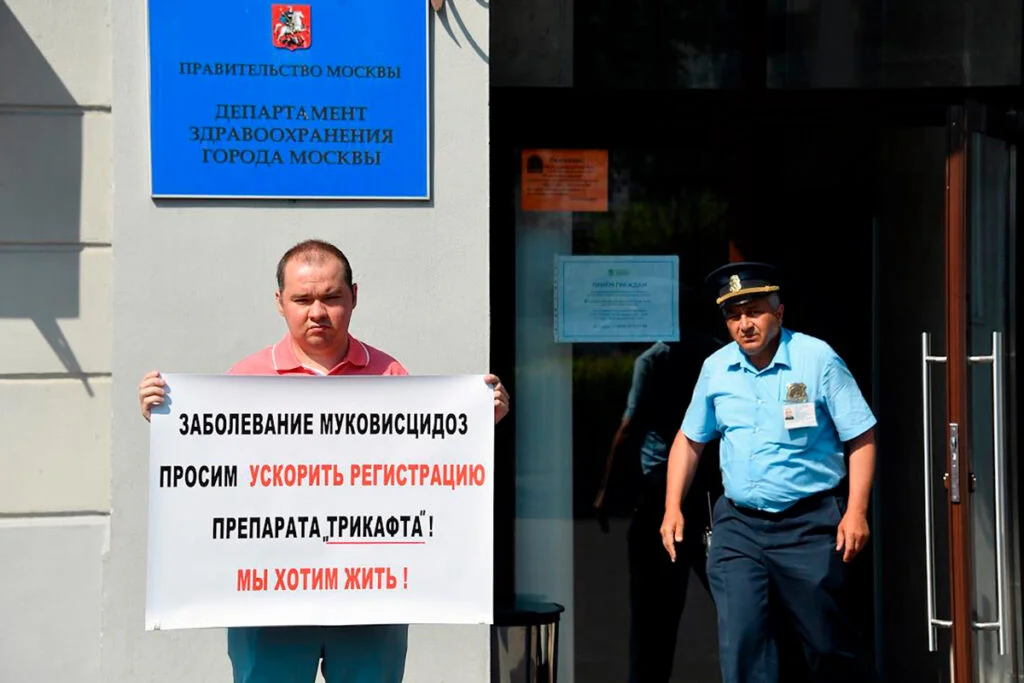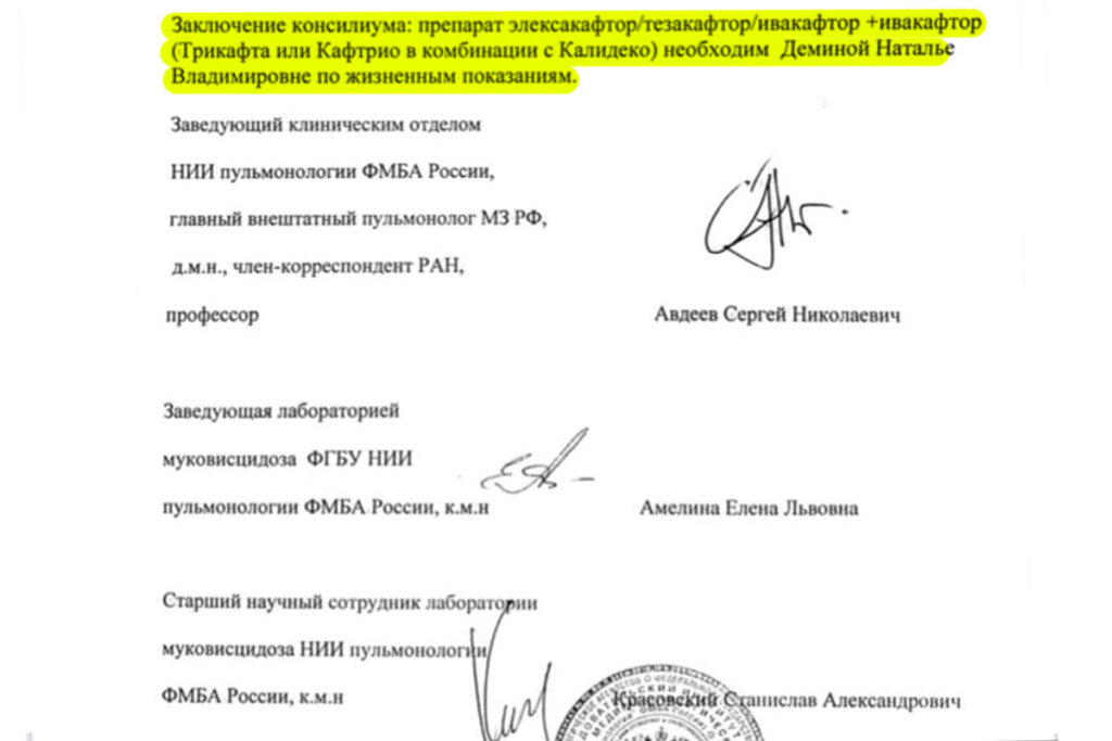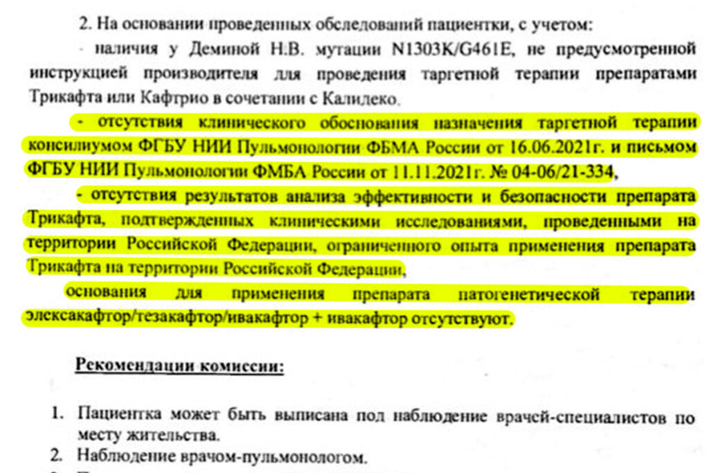 Препарат не зарегистрирован в РФ, но закон позволяет проводить индивидуальные закупки. Наталье лекарство не согласовали: Департамент здравоохранения Москвы заявил, что конкретно её мутация не прописана в инструкции к «Трикафте», несмотря на то, что у неё есть заключение о том, что препарат ей подходит. Кроме того, лекарство одобрено для 90 % пациентов: заболевание имеет тысячи мутаций, которые невозможно прописать в инструкциях.