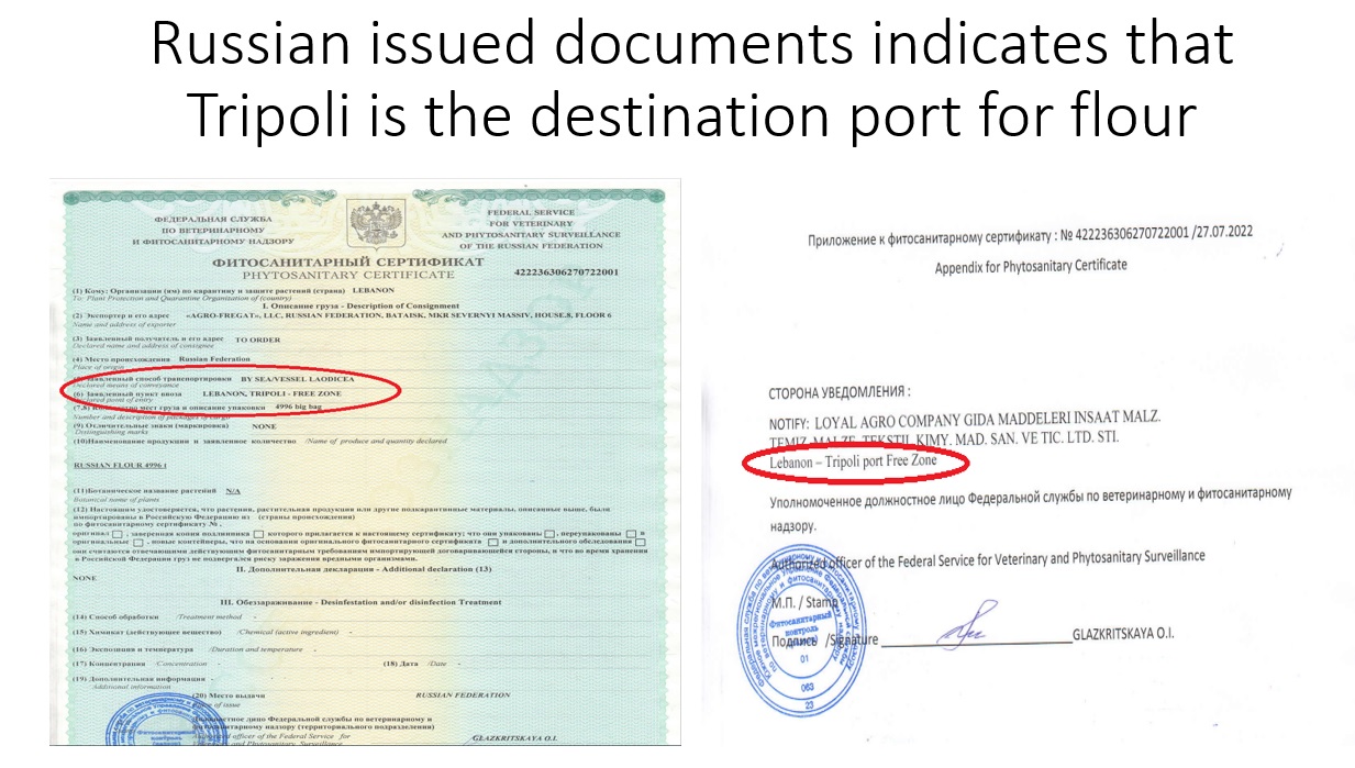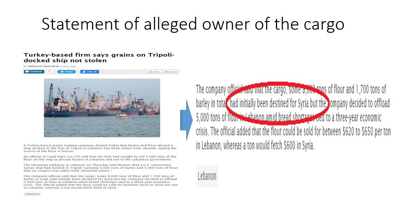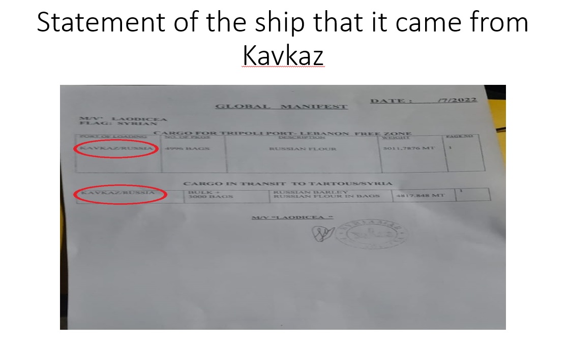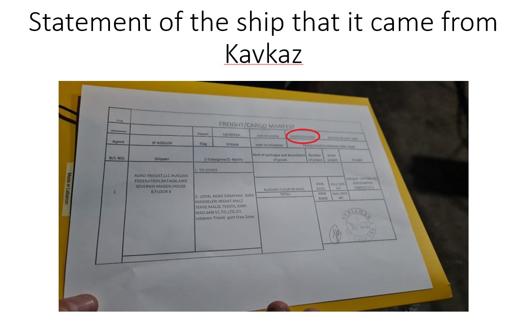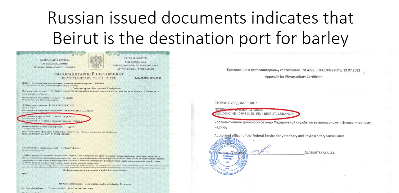«Эти два фейковых документа выписаны на ливанские порты. Мука предназначена для порта Триполи (Ливан), а груз с ячменем был предназначен для Бейрута (Ливан). При этом в документе фигурирует Башир Аль Карнази. Его поиски ливанскими журналистами в Бейруте не увенчались успехом, поскольку этого сирийца нет в Ливане», – сообщили в украинском посольстве.