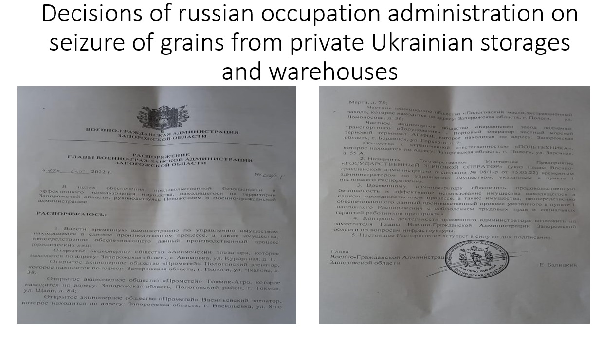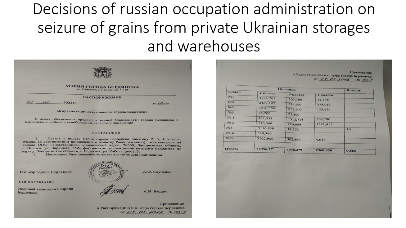 Посольство Украины в Ливане представило также на пресс-конференции копии документов российских оккупационных властей Бердянска, которые, по сообщению украинских дипломатов, свидетельствуют о вывозе зерна с оккупированных территорий Украины.