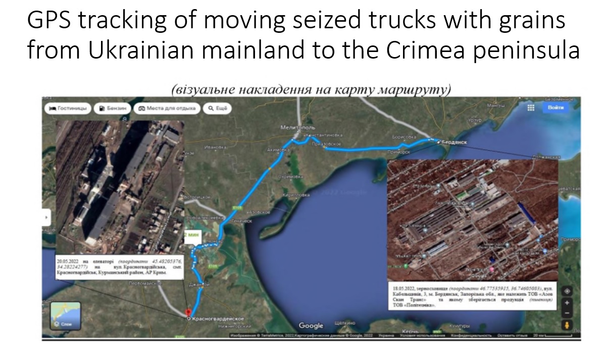 Вывоз Россией украинского зерна через оккупированный Крым в третьи страны расследует украинская прокуратура. Российские власти не комментируют заявления Киева, однако подконтрольные России представители «администраций» оккупированных территорий юга Украины публично подтверждали, что вывозят украинское зерно в аннексированный Крым. Российский глава Крыма Сергей Аксенов признавал, что Россия продает украинское зерно.