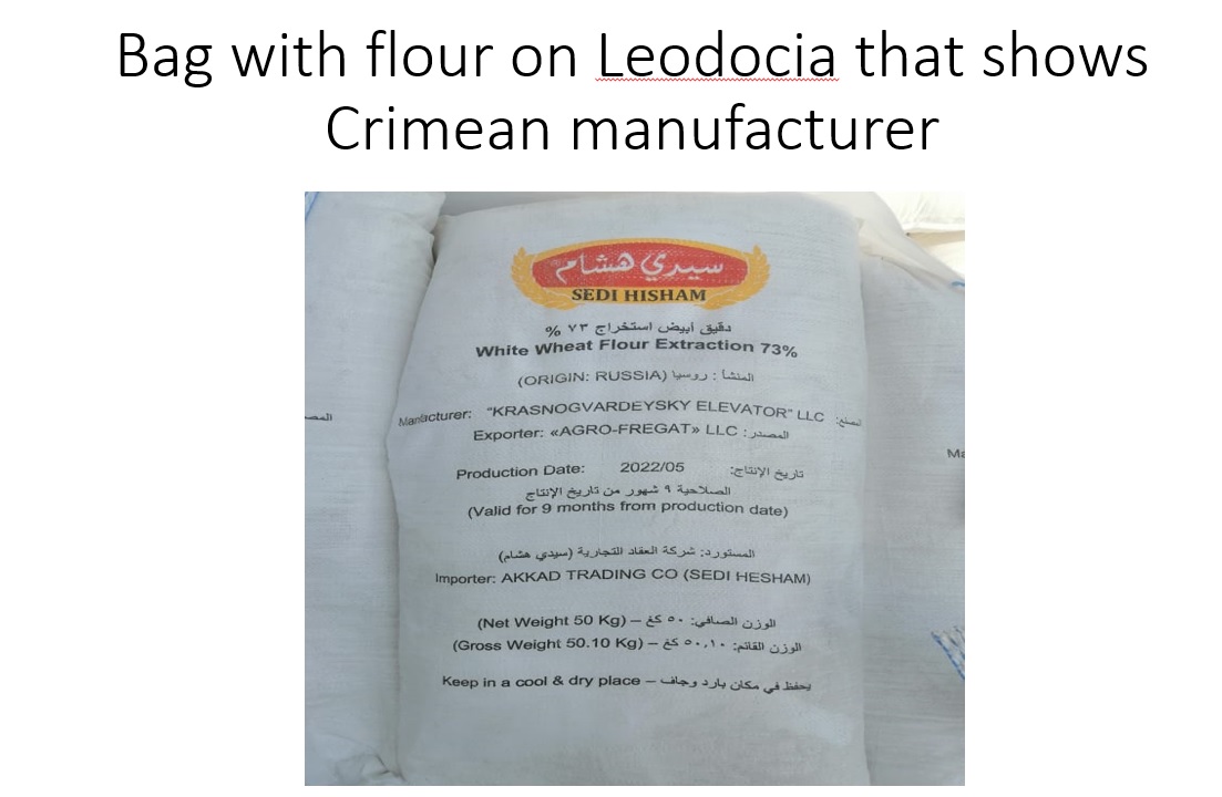 В числе доказательств, которые украинское посольство представило на пресс-конференции – фотография мешка муки с борта судна LAODICEA, на котором написано, что муку мололи на элеваторе в пгт Красногвардейское в Крыму, на предприятии LLC KRASNOGVARDEYSKY ELEVATOR.