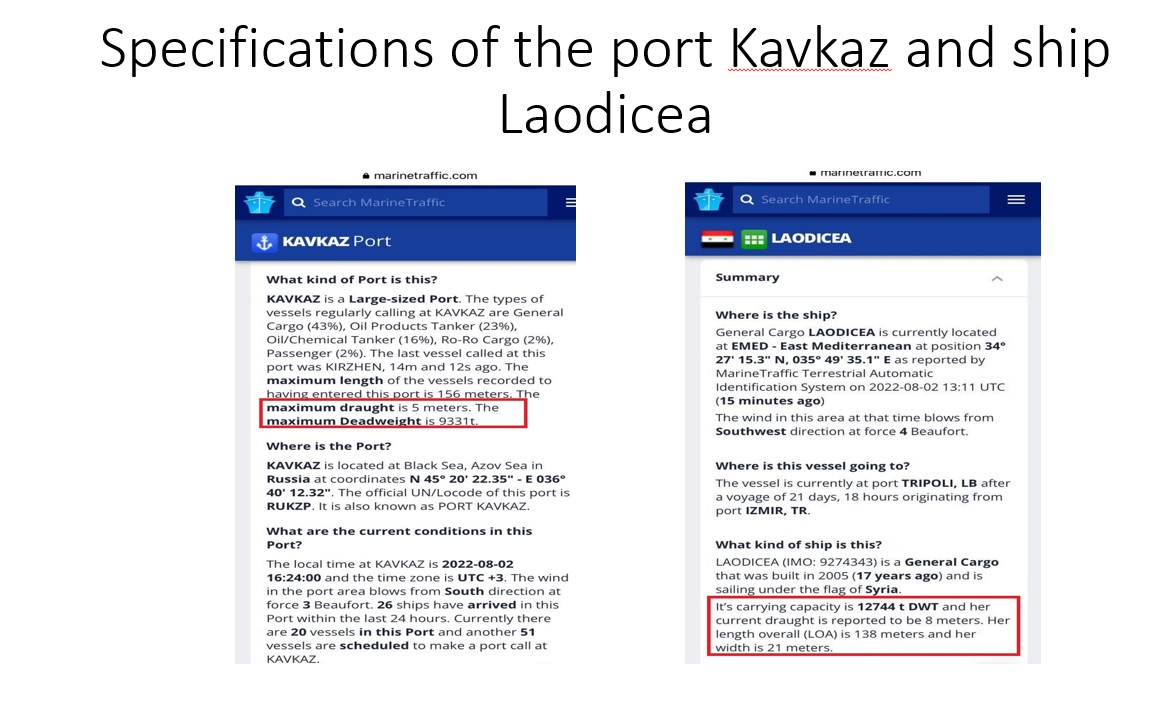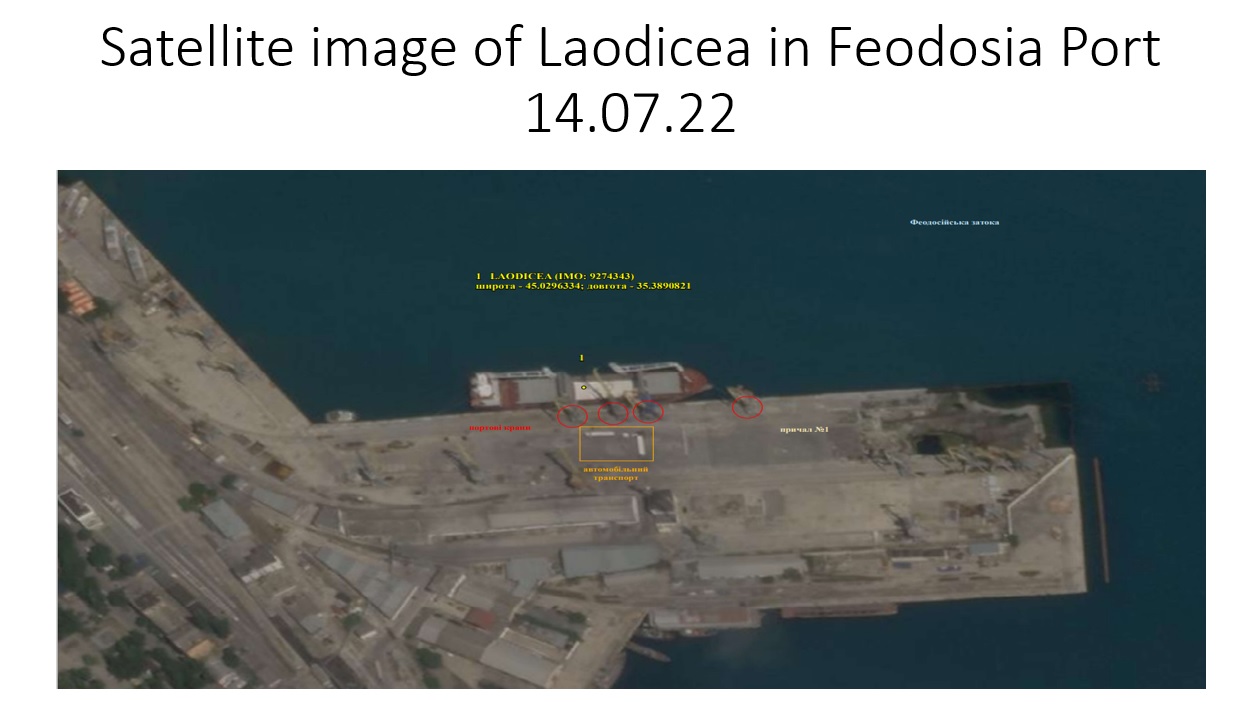 Украинские дипломаты проследили путь балкера LAODICEA от закрытых Киевом портов Крыма до порта Триполи. Посольство представило фотографии сирийского судна в морском порту Феодосии во время загрузки. А также доказало, что этот сухогруз не мог идти в российский порт «Кавказ», как указывалось в документах, поскольку этот порт может принимать судна с осадкой не более 5 м и общей грузоподъемностью 9331 тонн, в то время как LAODICEA имеет осадку около 8 м и грузоподъемность 12 744 тонн.