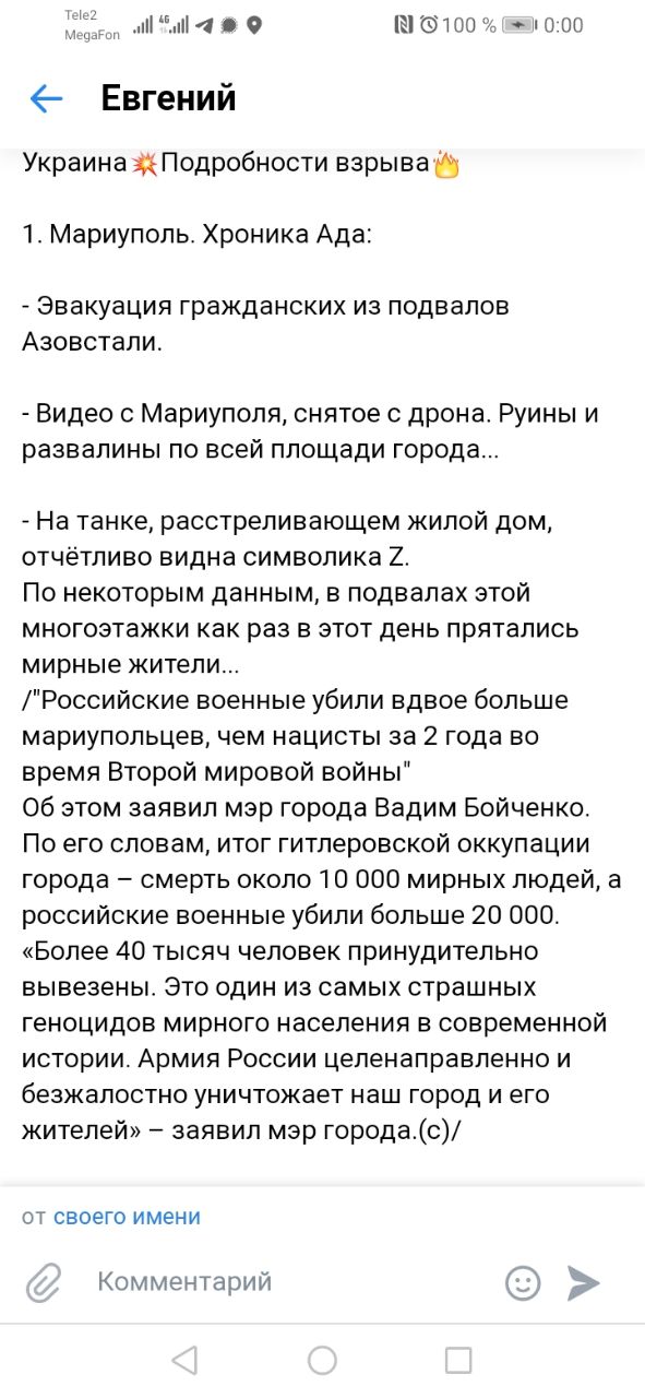 – Завели в СК: "Слезай, приехали". Основная претензия – я, видите ли, имел наглость не сверить изложенное в данном опусе с "заслуживающими доверия" официальными источниками типа "Российской газеты" и брифингов Конашенкова (когда она упомянула теле-Геббельса Минобороны, извините за резкость, меня прям затошнило). А еще против меня сыграло то, что мой профиль, на который я сделал данный репост из закрытой группы, на тот момент был открытым. Оказывается, публикацию закрытой группы в этом случае видят предполагаемые читатели "ВКонтакте". "Ведь любой мог зайти на вашу страницу и это прочитать!" – заявили они человеку с 670 друзьями и 252 подписчиками в аккаунте, – поясняет ученый.