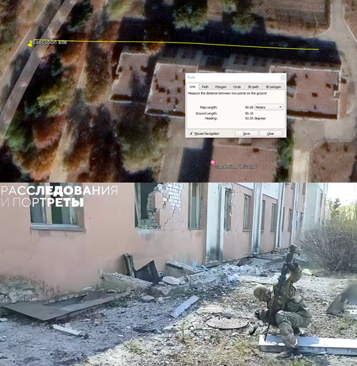 Монгуш также утверждал, что в ФСБ ему сообщили, что видео было снято в «Приволье» — так называется санаторий на восточном берегу Севрного Донца. И действительно, сопоставляя некоторые кадры из съемки с истязаниями и фото с территории санатория, Bellingcat смог обнаружить место рядом с санаторием, где, как и на видео, рядом расположены канализационный люк и раздвоенное дерево.