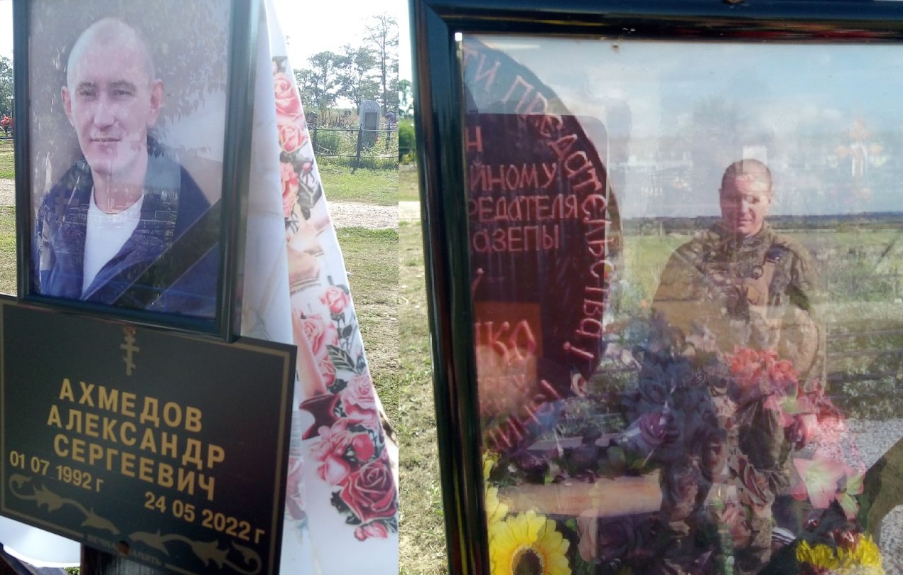 Речь идет об Александре Сергеевиче Ахмедове (1992 – 24 мая 2022) и Иване Васильевиче Арефьеве (1982 – 29 мая 2022). На могиле Арефьева – фото в камуфляжной форме рядом с пропагандистским памятником в оккупированном Россией Донецке. В открытых источниках информации о гибели Ахмедова и Арефьева нет.