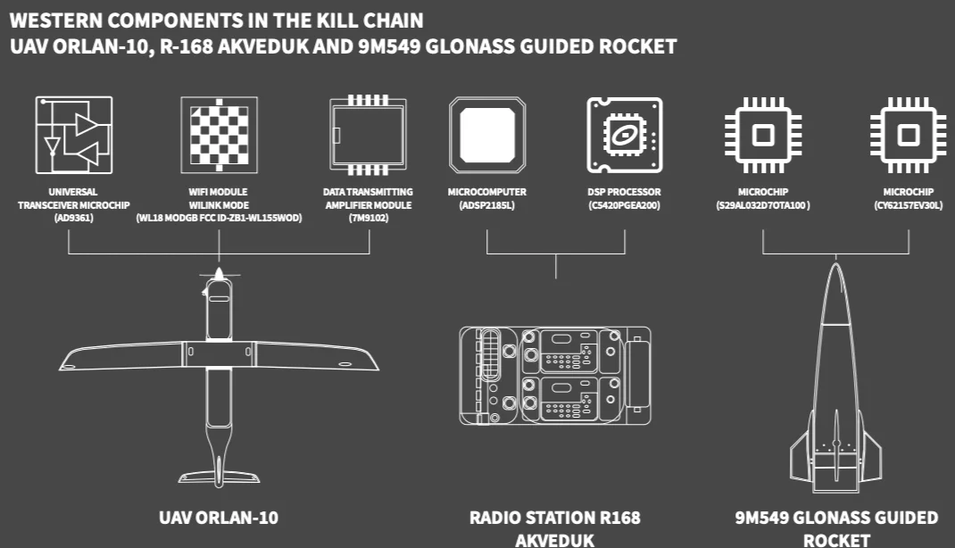 В беспилотнике «Орлан-10» используется камера Sony на американском двигателе Hextronik. Его система управления базируется на микроконтроллере от швейцарской компании STMicroelectronics, а двигатель произведен японской компанией Saito Seisakusho. Комплекс радиосвязи «Акведук» содержит больше 10 компонентов, произведенных за рубежом, в том числе американские микроконтроллер и цифровой сигнальный процессор, говорится в докладе.