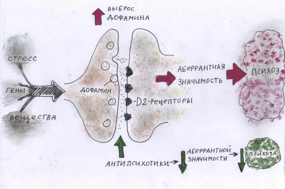 В 2009 году Оливер Хоус и Шитий Капур опубликовали статью под названием «Дофаминовая гипотеза шизофрении: версия III — общий финальный путь»15. О каком финальном пути идет речь? По мнению авторов, взаимодействие разнообразных факторов риска приводит в итоге к дофаминовой дисрегуляции, которая и является этим общим результатом влияний, приводящих к развитию психоза при шизофрении. Второе положение их гипотезы смещает фокус с нарушений на уровне рецепторов к дофамину и переводит его на предыдущее звено — на уровень пресинаптической регуляции. Согласно третьему положению, дофаминовая дисрегуляция скорее связана с психозом или со склонностью к психозу, а не собственно с шизофренией. И, наконец, гипотеза предполагает, что нарушения регуляции дофамина приводят к изменениям в оценках стимулов. Это происходит за счет нарушения процесса присвоения этим стимулам значимости, в который предположительно вовлечен дофамин.