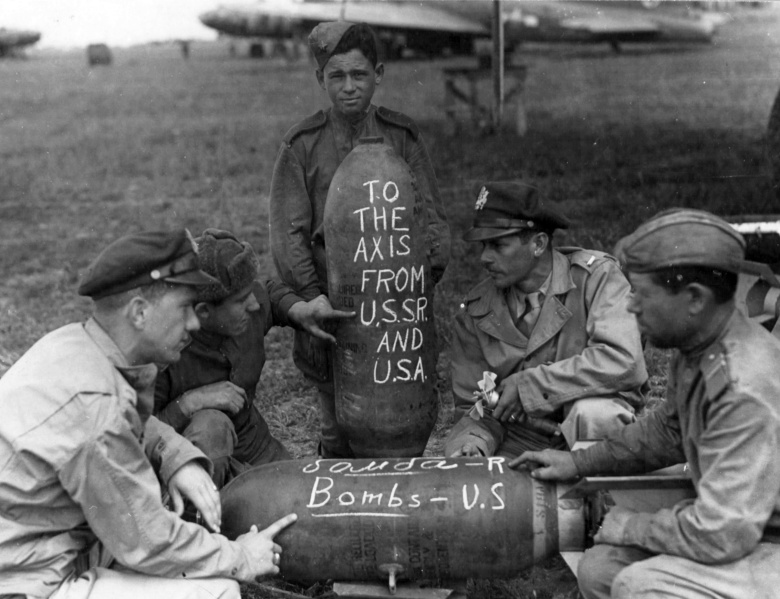 Советские и американские военнослужащие пишут послания врагу на авиабомбах. На заднем плане бомбардировщик B-17 «Летающая крепость» и транспортный самолет C-47 «Дакота». Полтава, лето 1944 г.