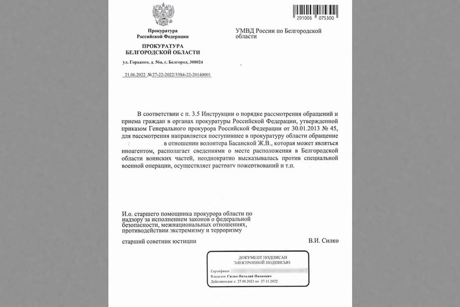 Спустя сутки в комментариях к посту Калатуры пользовательница соцсети Анастасия Золотова, в профиле которой местом жительства стоит Белгород, выложила сканы обращений в центр по борьбе с экстремизмом и в прокуратуру Белгородской области. В этих письмах Золотова обвинила Жанну Басанскую в том, что та якобы является иноагентом, собирает сведения о расположении воинских частей, выступает против спецоперации и растрачивает пожертвования.