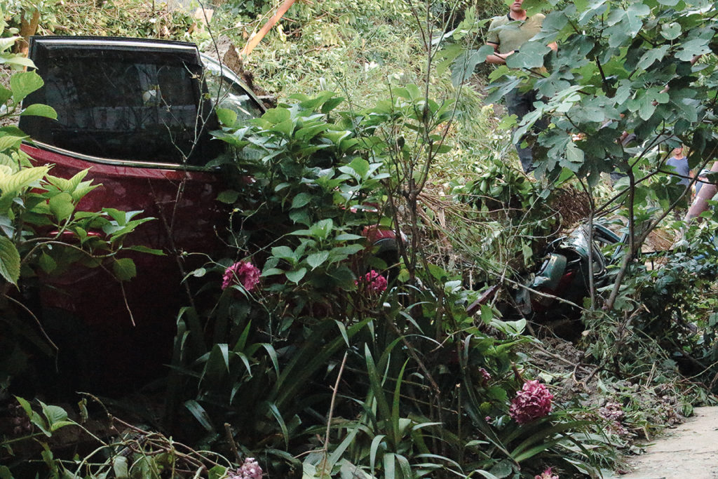 Дохожу до продуктового рынка в конце улицы. Под магистралью — унесенная водой «газель» с вмятинами на двери. Селевой поток, кажется, сделал ее просто грудой металла. У ближайшего к дороге продуктового магазина разбросаны арбузы и мешки с углем. Продавщица поливает холодильник водой из шланга. Она извиняется и отказывается разговаривать, потому что «устала от всего».